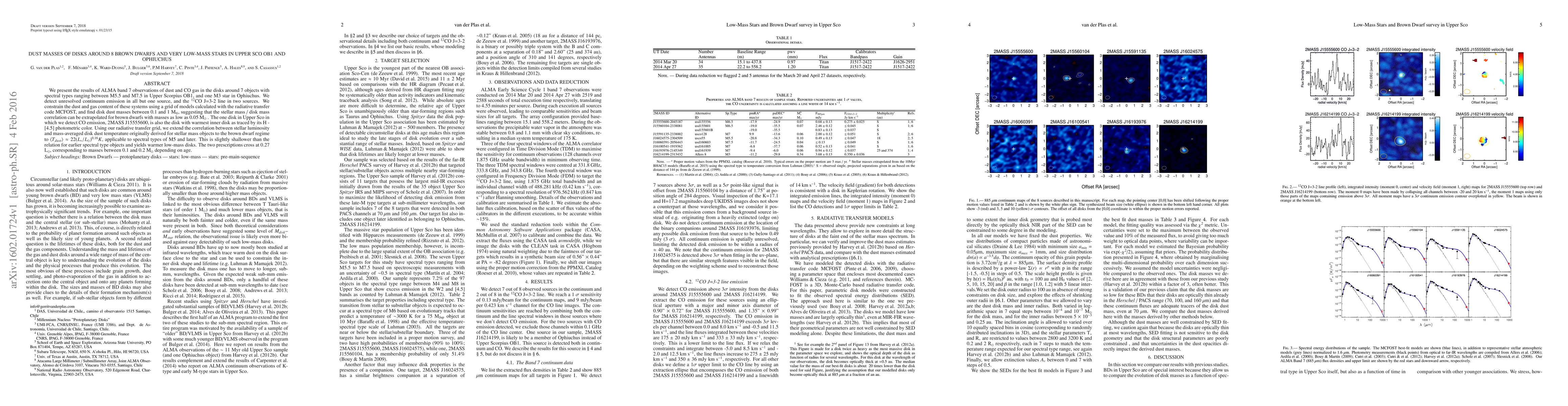We present the results of ALMA band 7 observations of dust and CO gas in the disks around 7 objects with spectral types ranging between M5.5 and M7.5 in Upper Scorpius OB1, and one M3 star in Ophiuchus. We detect unresolved continuum emission in all but one source, and the $^{12}$CO J=3-2 line in two sources. We constrain the dust and gas content of these systems using a grid of models calculated with the radiative transfer code MCFOST, and find disk dust masses between 0.1 and 1 M$_\oplus$, suggesting that the stellar mass / disk mass correlation can be extrapolated for brown dwarfs with masses as low as 0.05 M$_\odot$. The one disk in Upper Sco in which we detect CO emission, 2MASS J15555600, is also the disk with warmest inner disk as traced by its H - [4.5] photometric color. Using our radiative transfer grid, we extend the correlation between stellar luminosity and mass-averaged disk dust temperature originally derived for stellar mass objects to the brown dwarf regime to $\langle T_{dust} \rangle \approx 22 (L_{*} /L_{\odot})^{0.16} K$, applicable to spectral types of M5 and later. This is slightly shallower than the relation for earlier spectral type objects and yields warmer low-mass disks. The two prescriptions cross at 0.27 L$_\odot$, corresponding to masses between 0.1 and 0.2 M$_\odot$ depending on age.