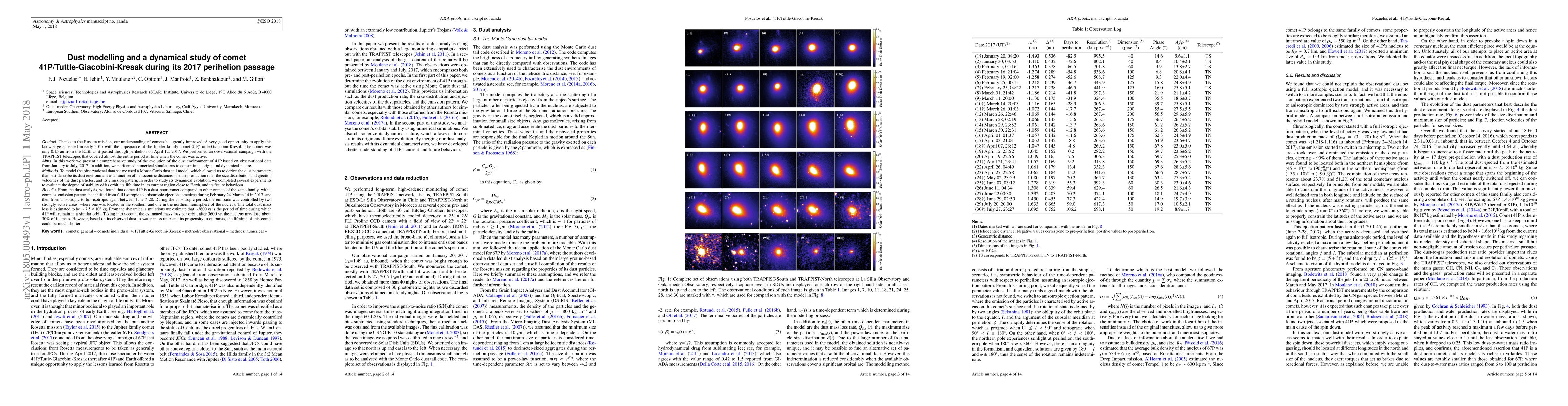 Thanks to the Rosetta mission, our understanding of comets has greatly improved. A very good opportunity to apply this knowledge appeared in early 2017 with the appearance of the Jupiter family comet 41P/TGK. We performed an observational campaign with the TRAPPIST telescopes that covered almost the entire period of time when the comet was active. In this work we present a comprehensive study of the evolution of the dust environment of 41P based on observational data from January to July, 2017. Also, we performed numerical simulations to constrain its origin and dynamical nature. To model the observational data set we used a Monte Carlo dust tail model, which allowed us to derive the dust parameters that best describe its dust environment as a function of heliocentric distance. In order to study its dynamical evolution, we completed several experiments to evaluate the degree of stability of its orbit, its life time in its current region close to Earth, and its future behaviour. From the dust analysis, we found that comet 41P has a complex emission pattern that shifted from full isotropic to anisotropic ejection sometime during February 24-March 14 in 2017, and then from anisotropic to full isotropic again between June 7-28. During the anisotropic period, the emission was controlled by two strongly active areas, where one was located in the southern and one in the northern hemisphere of the nucleus. The total dust mass loss is estimated to be $\sim7.5\times10^{8}$ kg. From the dynamical simulations we estimate that $\sim$3600 yr is the period of time during which 41P will remain in a similar orbit. Taking into account the estimated mass loss per orbit, after 3600 yr, the nucleus may lose about 30$\%$ of its mass. However, based on its observed dust-to-water mass ratio and its propensity to outbursts, the lifetime of this comet could be much shorter.