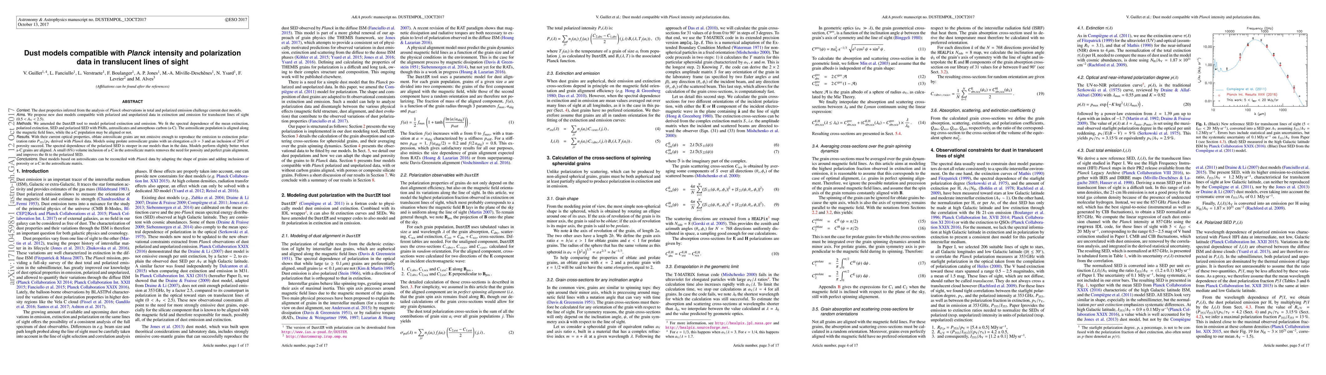 The dust properties inferred from the analysis of Planck observations in total and polarized emission challenge current dust models. We propose new dust models compatible with polarized and unpolarized data in extinction and emission for translucent lines of sight ($0.5 < A_V < 2.5$). We amended the DustEM tool to model polarized extinction and emission. We fit the spectral dependence of the mean extinction, polarized extinction, SED and polarized SED with PAHs, astrosilicates and amorphous carbon (a-C). The astrosilicate population is aligned along the magnetic field lines, while the a-C population may be aligned or not. With their current optical properties, oblate astrosilicate grains are not emissive enough to reproduce the emission to extinction polarization ratio $P_{353}/p_V$ derived with Planck data. Models using prolate astrosilicate grains with an elongation $a/b=3$ and an inclusion of 20% of porosity succeed. The spectral dependence of the polarized SED is steeper in our models than in the data. Models perform slightly better when a-C grains are aligned. A small (6%) volume inclusion of a-C in the astrosilicate matrix removes the need for porosity and perfect grain alignment, and improves the fit to the polarized SED. Dust models based on astrosilicates can be reconciled with Planck data by adapting the shape of grains and adding inclusions of porosity or a-C in the astrosilicate matrix.