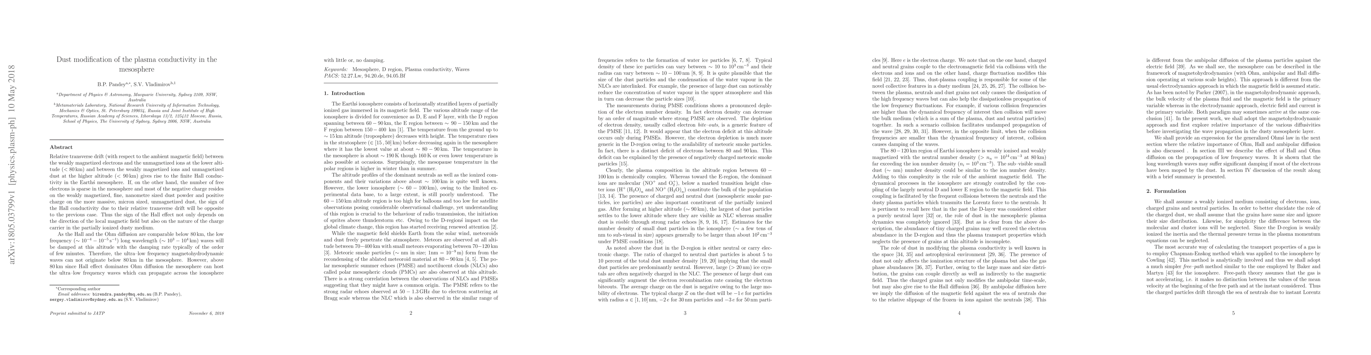 The study shows that dust modification of plasma conductivity in the mesosphere can create ultra-low frequency waves, which can propagate across the ionosphere with little damping, depending on the altitude and nature of charge carriers.
