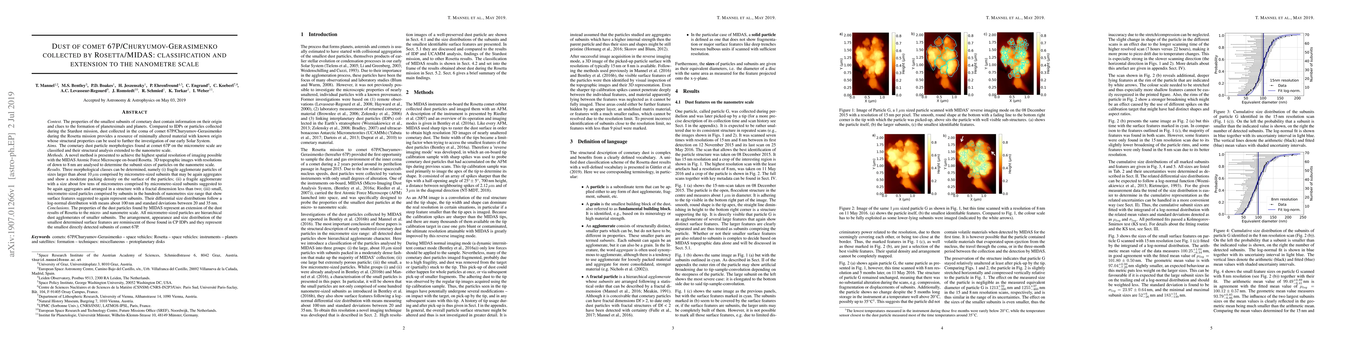 The properties of the smallest subunits of cometary dust contain information on their origin and clues to the formation of planetesimals and planets. Compared to IDPs or particles collected during the Stardust mission, dust collected in the coma of comet 67P/Churyumov-Gerasimenko during the Rosetta mission provides a resource of minimally altered material with known origin whose structural properties can be used to further the investigation of our early Solar System. A novel method is presented to achieve the highest spatial resolution of imaging possible with the MIDAS Atomic Force Microscope on-board Rosetta. 3D topographic images with resolutions of down to 8\,nm are analysed to determine the subunit sizes of particles on the nanometre scale. Three morphological classes can be determined, namely (i) fragile agglomerate particles of sizes larger than about 10\,$\mathrm{\mu m}$ comprised by micrometre-sized subunits that may be again aggregates and show a moderate packing density on the surface of the particles; (ii) a fragile agglomerate with a size about few tens of micrometres comprised by micrometre-sized subunits suggested to be again aggregates and arranged in a structure with a fractal dimension less than two; (iii) small, micrometre-sized particles comprised by subunits in the hundreds of nanometres size range that show surface features suggested to again represent subunits. Their differential size distributions follow a log-normal distribution with means about 100\,nm and standard deviations between 20 and 35\,nm. All micrometre-sized particles are hierarchical dust agglomerates of smaller subunits. The arrangement, appearance and size distribution of the smallest determined surface features are reminiscent of those found in CP IDPs and they represent the smallest directly detected subunits of comet 67P.