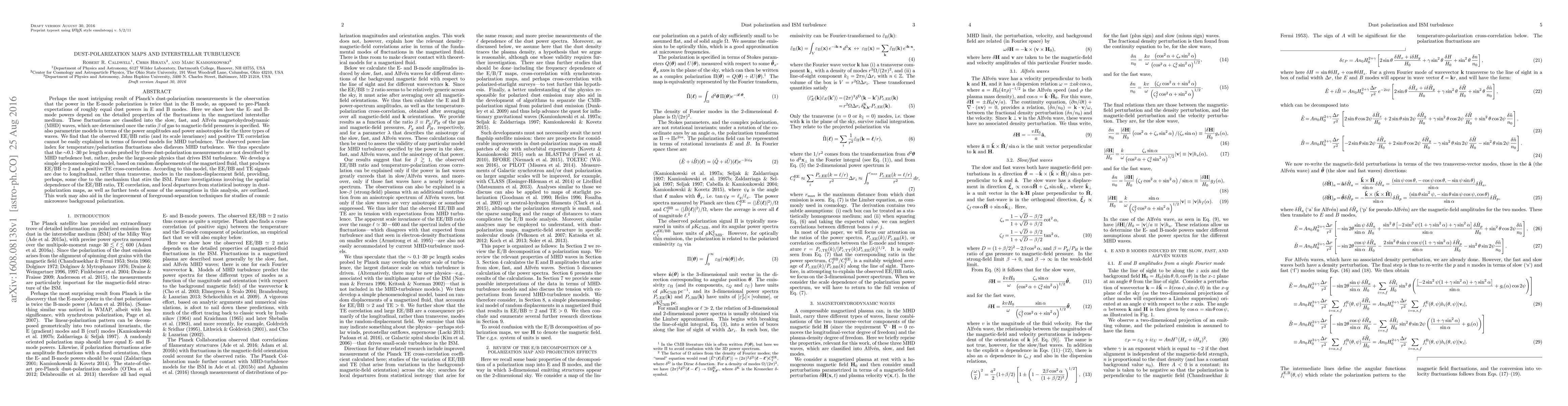 Perhaps the most intriguing result of Planck's dust-polarization measurements is the observation that the power in the E-mode polarization is twice that in the B mode, as opposed to pre-Planck expectations of roughly equal dust powers in E and B modes. Here we show how the E- and B-mode powers depend on the detailed properties of the fluctuations in the magnetized interstellar medium. These fluctuations are classified into the slow, fast, and Alfv\'en magnetohydrodynamic (MHD) waves, which are determined once the ratio of gas to magnetic-field pressures is specified. We also parametrize models in terms of the power amplitudes and power anisotropies for the three types of waves. We find that the observed EE/BB ratio (and its scale invariance) and positive TE correlation cannot be easily explained in terms of favored models for MHD turbulence. The observed power-law index for temperature/polarization fluctuations also disfavors MHD turbulence. We thus speculate that the 0.1--30 pc length scales probed by these dust-polarization measurements are not described by MHD turbulence but, rather, probe the large-scale physics that drives ISM turbulence. We develop a simple phenomenological model, based on random displacements of the magnetized fluid, that produces EE/BB $\simeq2$ and a positive TE cross-correlation. According to this model, the EE/BB and TE signals are due to longitudinal, rather than transverse, modes in the random-displacement field, providing, perhaps, some clue to the mechanism that stirs the ISM. Future investigations involving the spatial dependence of the EE/BB ratio, TE correlation, and local departures from statistical isotropy in dust-polarization maps, as well as further tests of some of the assumptions in this analysis, are outlined. This work may also aid in the improvement of foreground-separation techniques for studies of CMB polarization.