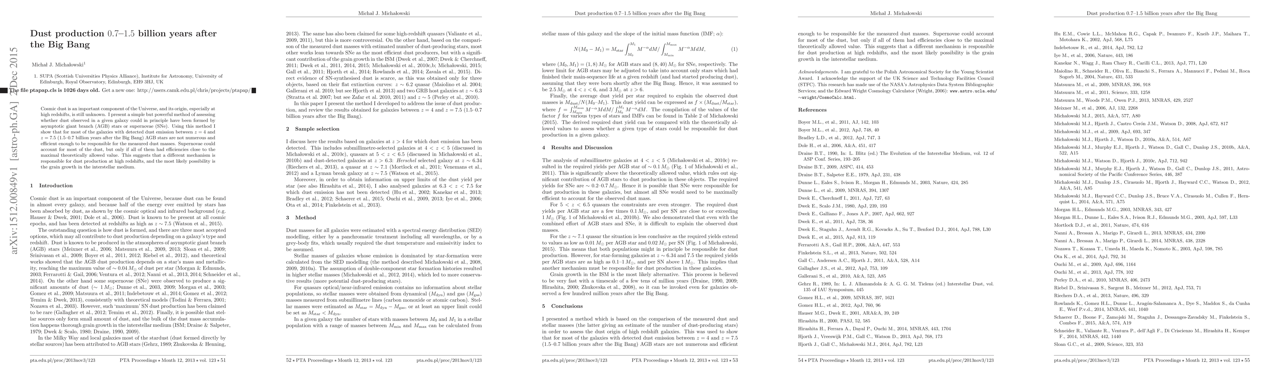 This paper proposes a method to determine the origin of cosmic dust in galaxies observed 0.7-1.5 billion years after the Big Bang, finding that neither AGB stars nor supernovae alone can account for the observed dust. It suggests that grain growth in the interstellar medium is the most likely source of dust at high redshifts.