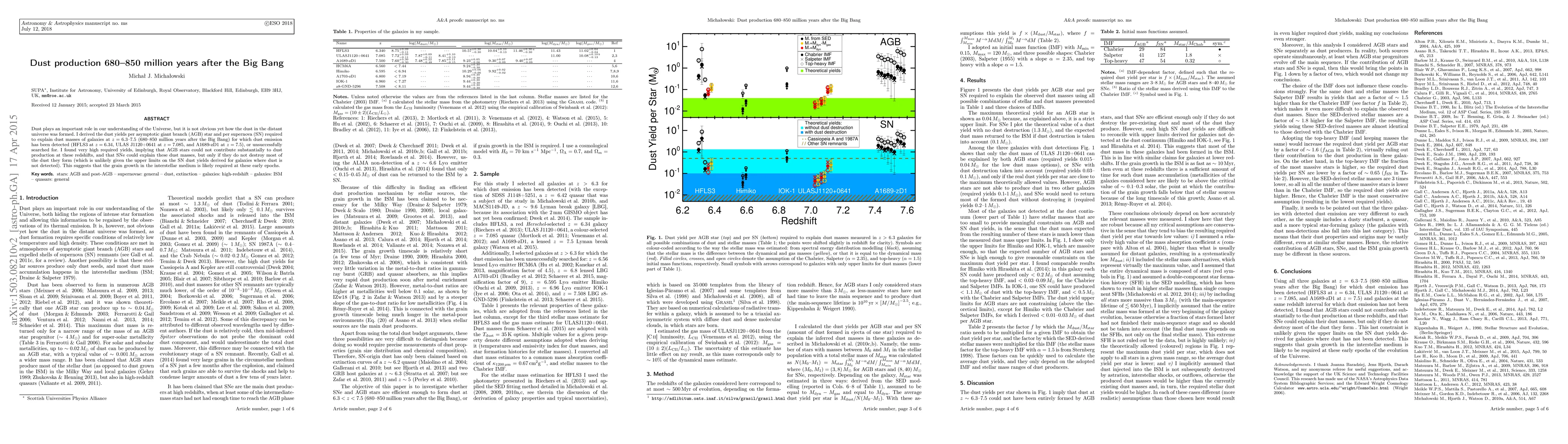 This paper investigates dust production in the early universe, finding that high dust yields are necessary to explain observed dust masses in galaxies 680-850 million years after the Big Bang. The study concludes that supernovae, rather than asymptotic giant branch stars, are likely the primary dust producers, though they must retain most of the dust they form, suggesting significant grain growth in the interstellar medium.