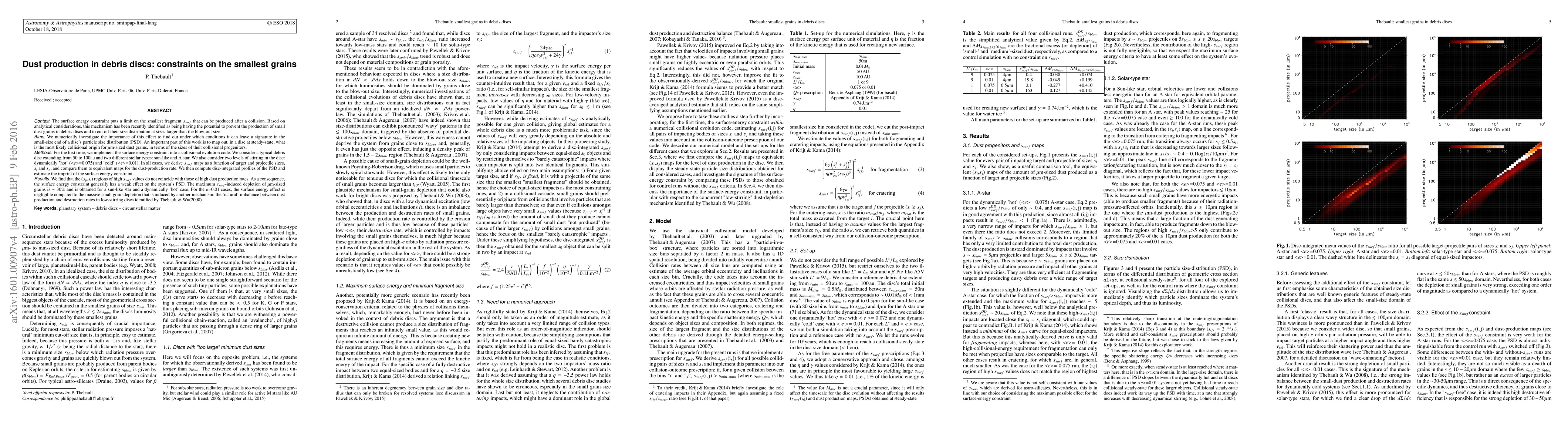 This paper investigates the impact of surface energy constraints on dust grain production in debris discs, finding that while these constraints can limit the smallest grains, their effect on the overall particle size distribution is generally weak, with a maximum depletion of about 30% for micron-sized grains in dynamically "hot" discs. The study also highlights that other mechanisms dominate the depletion of small grains in "cold" discs.