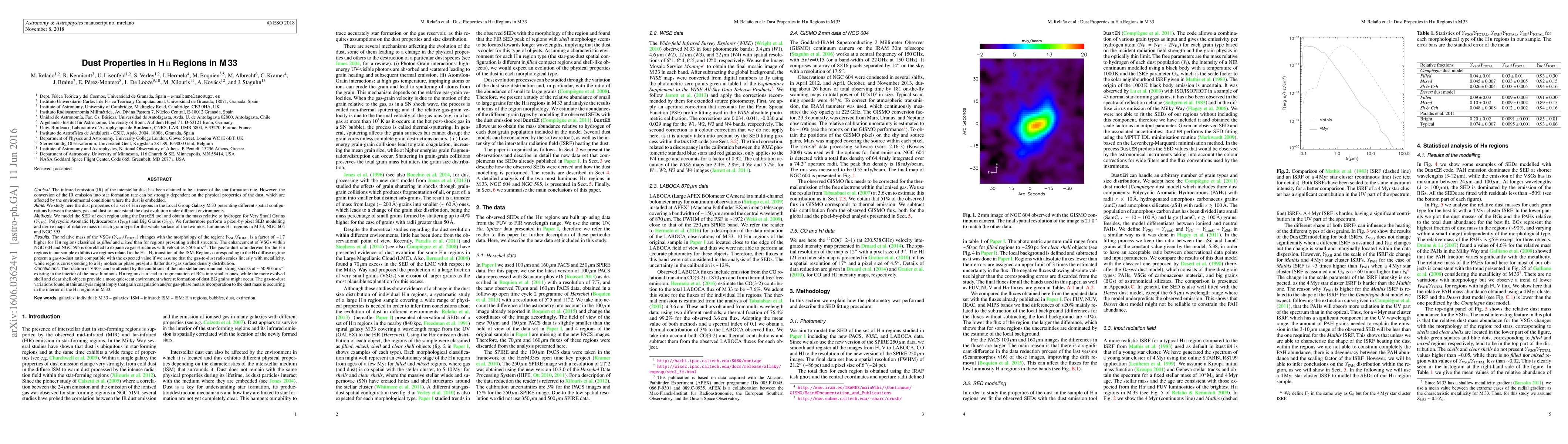 This study investigates the dust properties in HII regions of M33, finding that the relative mass of Very Small Grains is higher in filled and mixed regions compared to shell structures. The gas-to-dust ratio varies with the interstellar medium's transition from HI to H2, suggesting grain coagulation and metal incorporation in the dust mass.