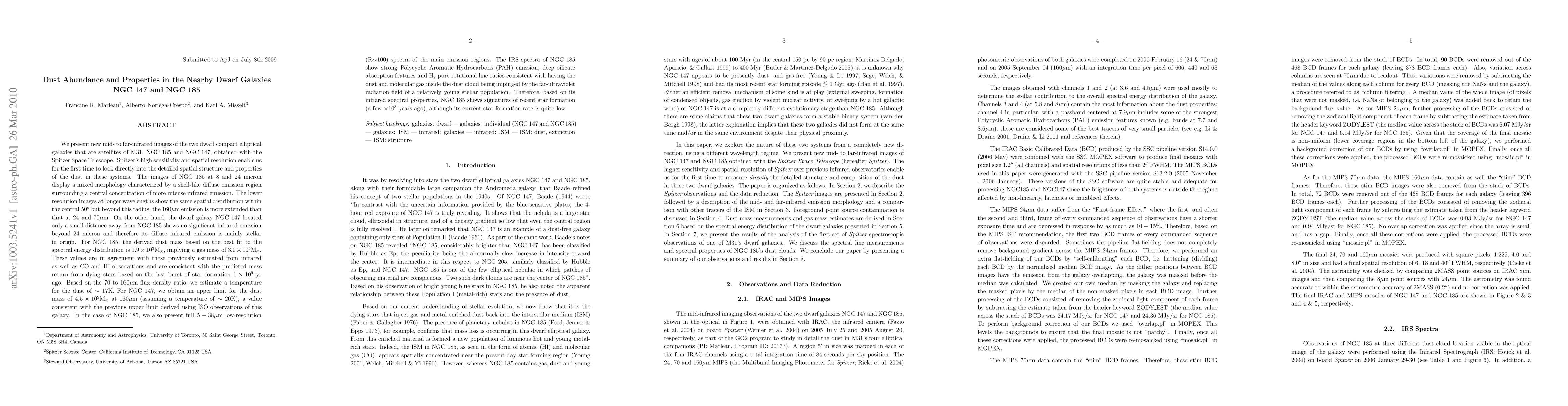 This paper uses Spitzer Space Telescope data to analyze the dust properties in the dwarf galaxies NGC 185 and NGC 147, revealing a shell-like dust distribution in NGC 185 and minimal dust in NGC 147, suggesting the former's dust mass is ~1.9e3 Msol, while NGC 147 has an upper dust mass limit of 4.5e2 Msol.