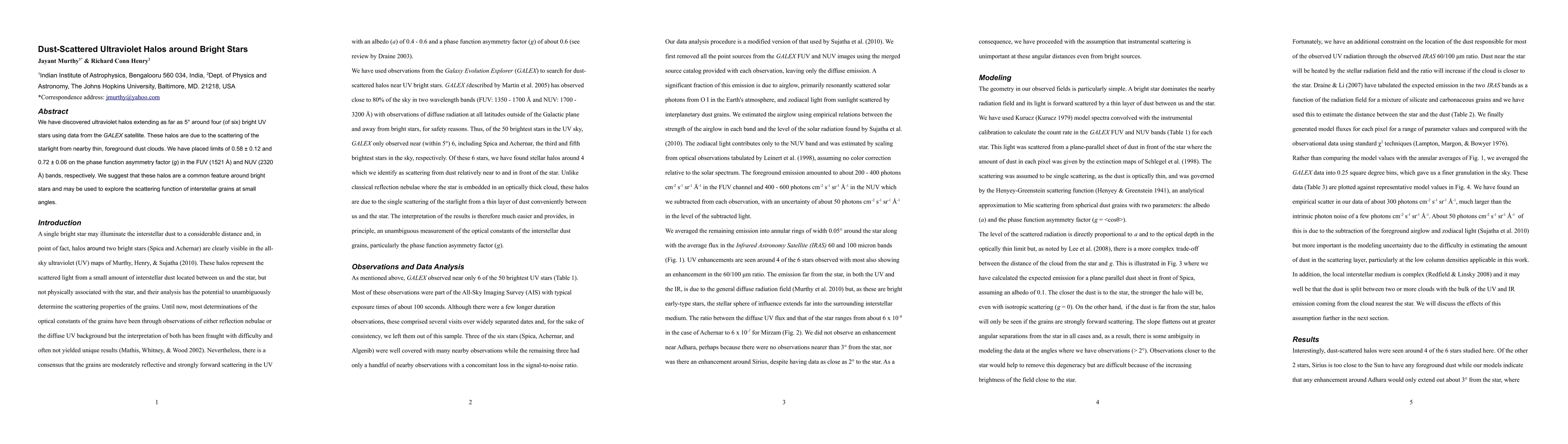 We have discovered ultraviolet halos extending as far as 5{\deg} around four (of six) bright UV stars using data from the GALEX satellite. These halos are due to the scattering of the starlight from nearby thin, foreground dust clouds. We have placed limits of 0.58 $\pm$ 0.12 and 0.72 $\pm$ 0.06 on the phase function asymmetry factor (g) and limits on the albedo of 0.10 $\pm$ 0.05 and 0.26 $\pm$ 0.10 in the FUV (1521 {\AA}) and NUV (2320 {\AA}) bands, respectively. We suggest that these halos are a common feature around bright stars and may be used to explore the scattering function of interstellar grains at small angles.