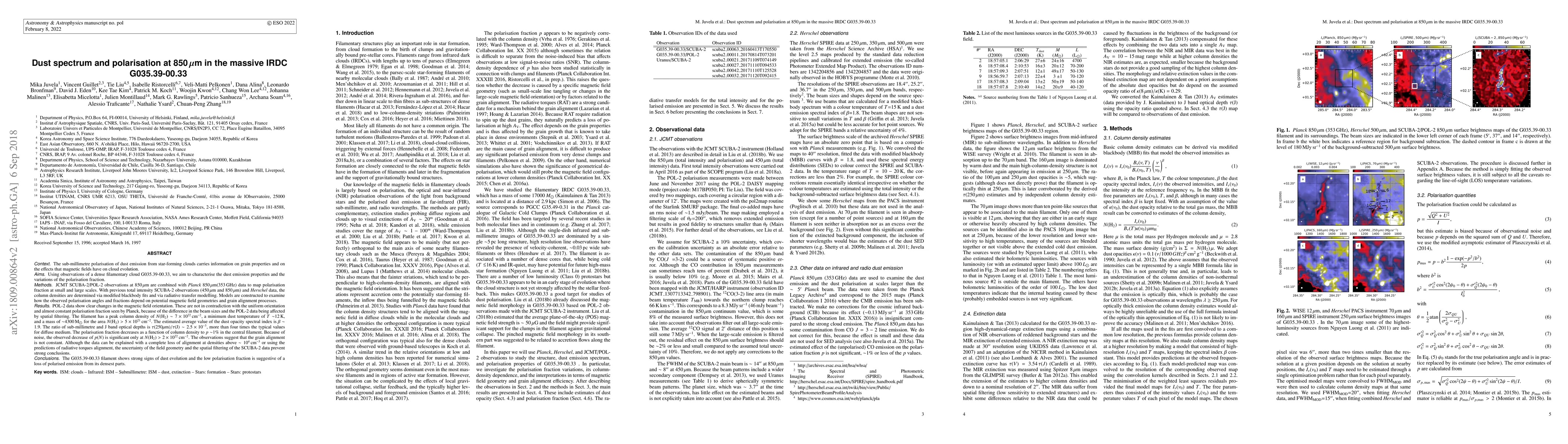 The study analyzes dust emission and polarization in the massive IRDC G035.39-00.33 using JCMT SCUBA-2/POL-2 and Planck 850um data. Key findings include variations in polarization fraction with column density, a peak column density of ~7x10^22 cm-2, and a mass of ~4300Msun for high column density regions. The average spectral index (beta ~ 1.9) and high tau(250 um)/tau(J) ratio (~2.5x10^-3) suggest dust evolution. The decrease in polarization fraction to ~1% in the central filament implies potential grain alignment changes or loss of polarised emission in dense regions.