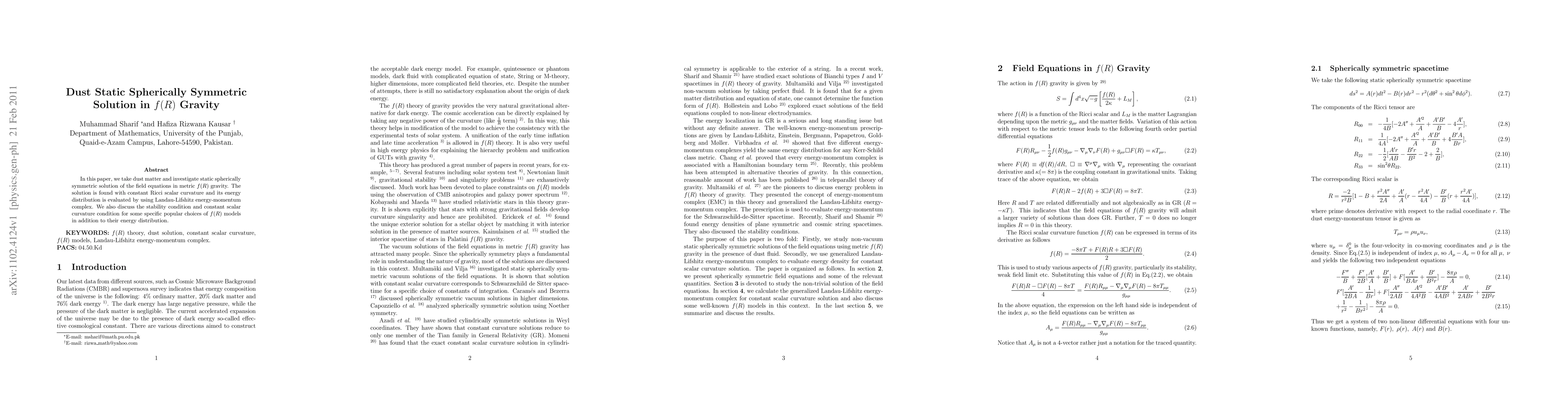 This paper explores static spherically symmetric dust solutions in metric f(R) gravity, deriving a solution with constant Ricci scalar curvature and evaluating its energy distribution via the Landau-Lifshitz complex. It also examines stability and scalar curvature conditions for selected f(R) models.