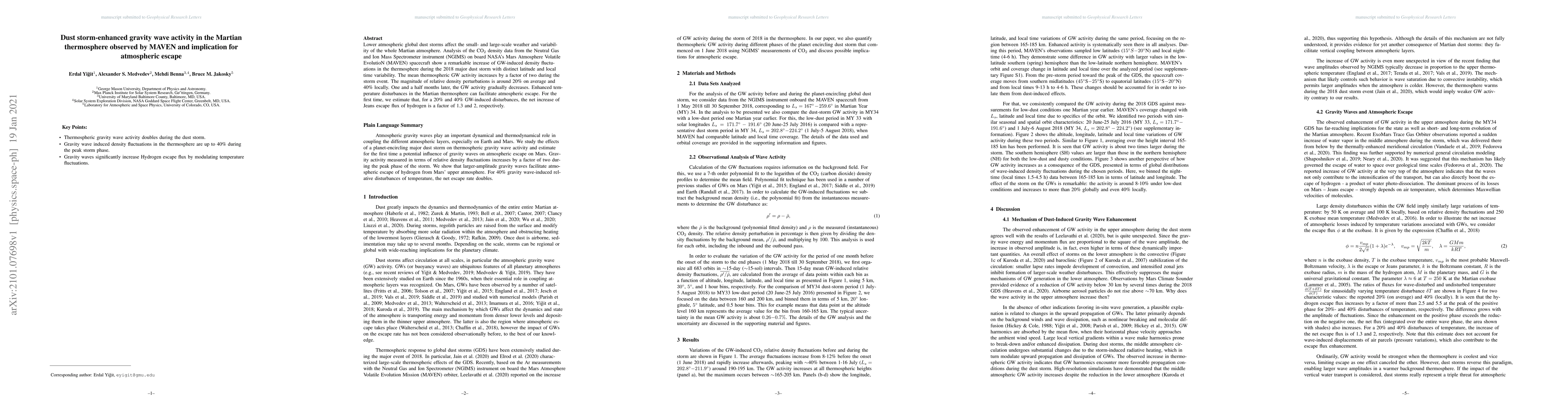 Lower atmospheric global dust storms affect the small- and large-scale weather and variability of the whole Martian atmosphere. Analysis of the CO$_2$ density data from the Neutral Gas and Ion Mass Spectrometer instrument (NGIMS) on board NASA's Mars Atmosphere Volatile EvolutioN (MAVEN) spacecraft show a remarkable increase of GW-induced density fluctuations in the thermosphere during the 2018 major dust storm with distinct latitude and local time variability. The mean thermospheric GW activity increases by a factor of two during the storm event. The magnitude of relative density perturbations is around 20% on average and 40% locally. One and a half months later, the GW activity gradually decreases. Enhanced temperature disturbances in the Martian thermosphere can facilitate atmospheric escape. For the first time, we estimate that, for a 20% and 40% GW-induced disturbances, the net increase of Jeans escape flux of hydrogen is a factor of 1.3 and 2, respectively.