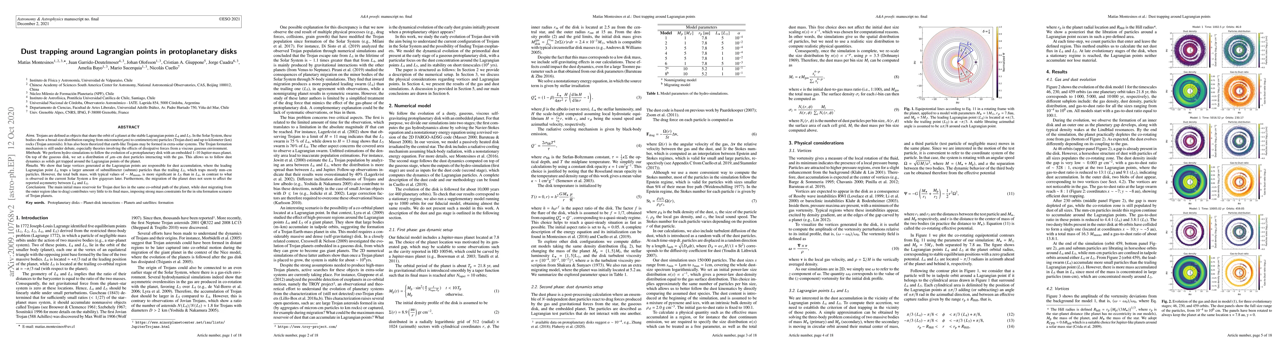A study using hydro-simulations found that large vortices at Lagrangian points in protoplanetary disks trap dust particles, with more submillimeter particles accumulating around L4 than mm-cm particles around L5, challenging current understanding of Trojan formation mechanisms.