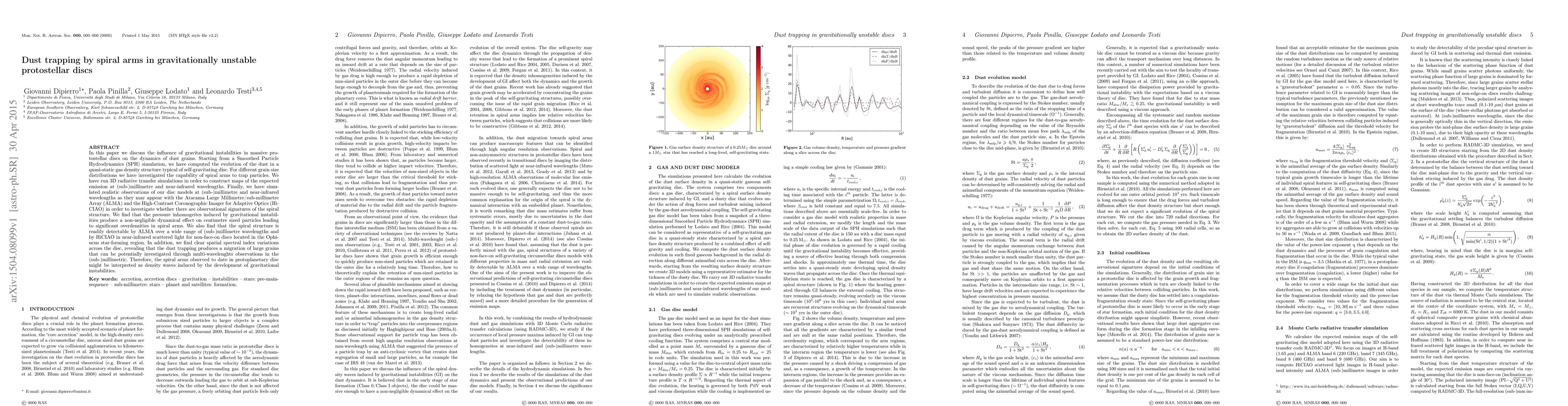 This paper investigates how gravitational instabilities in massive protostellar discs affect dust dynamics, finding that spiral arms can trap centimetre-sized particles, leading to observable density waves. The study uses SPH simulations and radiative transfer models to predict emission signatures detectable by ALMA and HiCIAO, revealing spatial spectral index variations indicating grain migration.