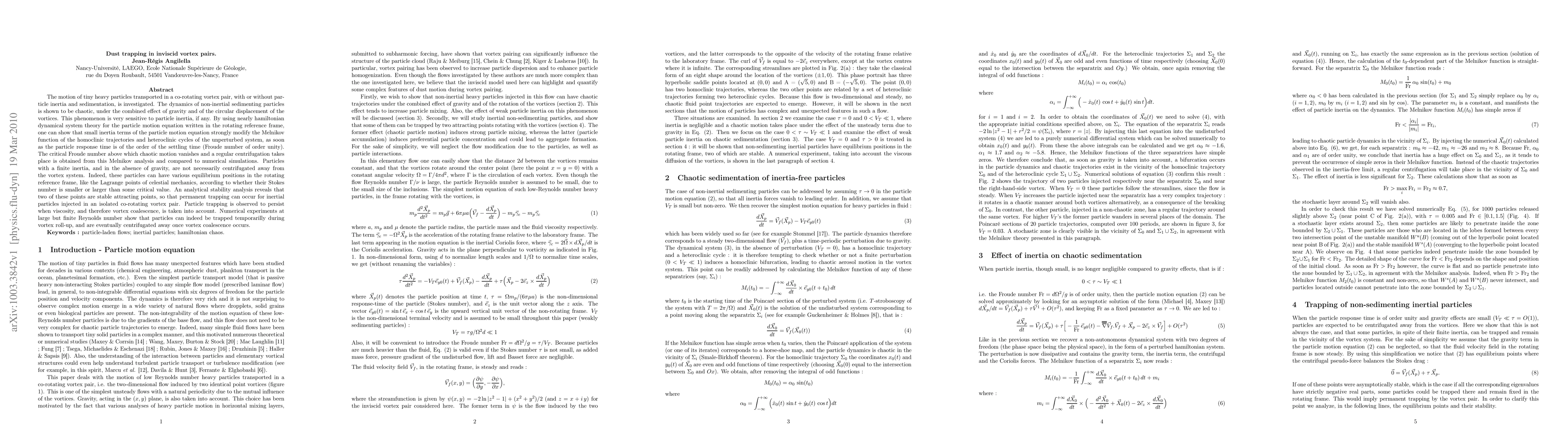 This paper investigates the dynamics of heavy particles in co-rotating vortex pairs, showing that particle inertia and sedimentation lead to chaotic motion influenced by gravity. Analytical and numerical methods reveal that inertial particles can be trapped in stable equilibrium positions within the vortex system, though vortex coalescence eventually leads to their centrifugation.