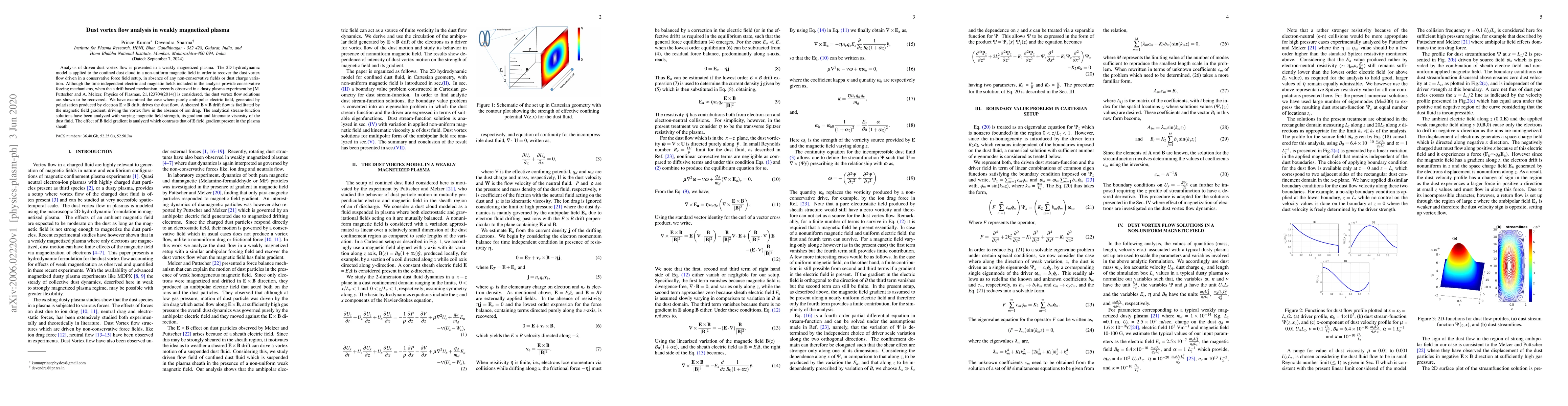 This paper analyzes driven dust vortex flow in weakly magnetized plasma using a 2D hydrodynamic model, focusing on conservative force fields and the role of magnetic field gradients in vortex formation, driven by ambipolar electric fields and E*B drift mechanisms. Analytical stream-function solutions are examined under varying magnetic field strengths and kinematic viscosity.