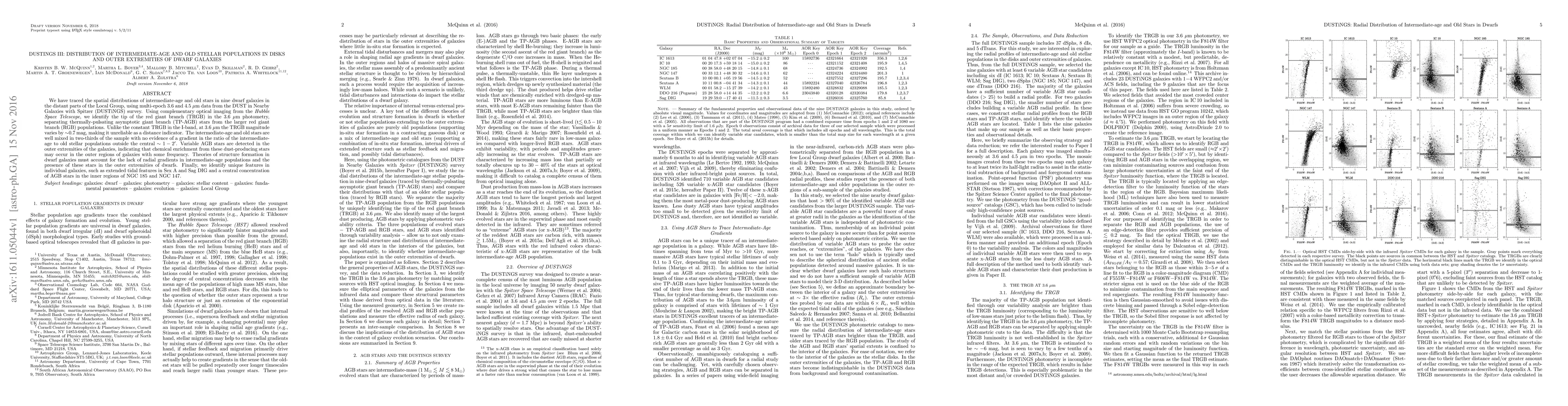 We have traced the spatial distributions of intermediate-age and old stars in nine dwarf galaxies in the distant parts of the Local Group, using multi-epoch 3.6 and 4.5 micron data from the DUST in Nearby Galaxies with Spitzer (DUSTiNGS) survey. Using complementary optical imaging from the Hubble Space Telescope, we identify the tip of the red giant branch (TRGB) in the 3.6 micron photometry, separating thermally-pulsating asymptotic giant branch (TP-AGB) stars from the larger red giant branch (RGB) populations. Unlike the constant TRGB in the I-band, at 3.6 micron the TRGB magnitude varies by ~0.7 mag, making it unreliable as a distance indicator. The intermediate-age and old stars are well mixed in two-thirds of the sample with no evidence of a gradient in the ratio of the intermediate-age to old stellar populations outside the central ~1-2'. Variable AGB stars are detected in the outer extremities of the galaxies, indicating that chemical enrichment from these dust-producing stars may occur in the outer regions of galaxies with some frequency. Theories of structure formation in dwarf galaxies must account for the lack of radial gradients in intermediate-age populations and the presence of these stars in the outer extremities of dwarfs. Finally, we identify unique features in individual galaxies, such as extended tidal features in Sex A and Sag DIG and a central concentration of AGB stars in the inner regions of NGC 185 and NGC 147.