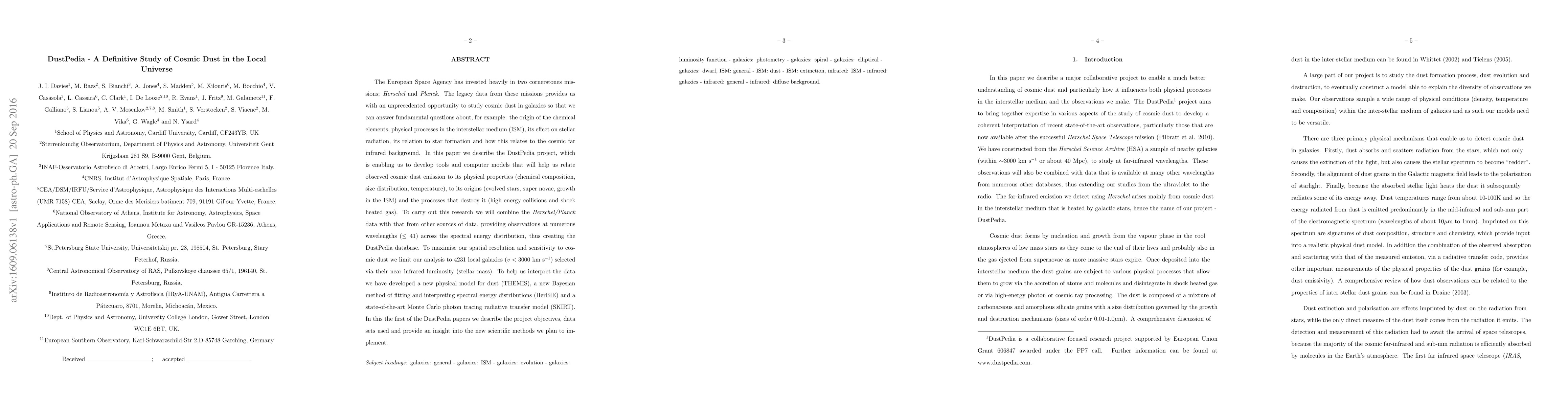 DustPedia aims to study cosmic dust in the local universe using data from ESA's Herschel and Planck missions, developing tools to link dust emission to its physical properties, origins, and destruction processes. The project combines multi-wavelength data to create a comprehensive database and employs advanced models for analysis.
