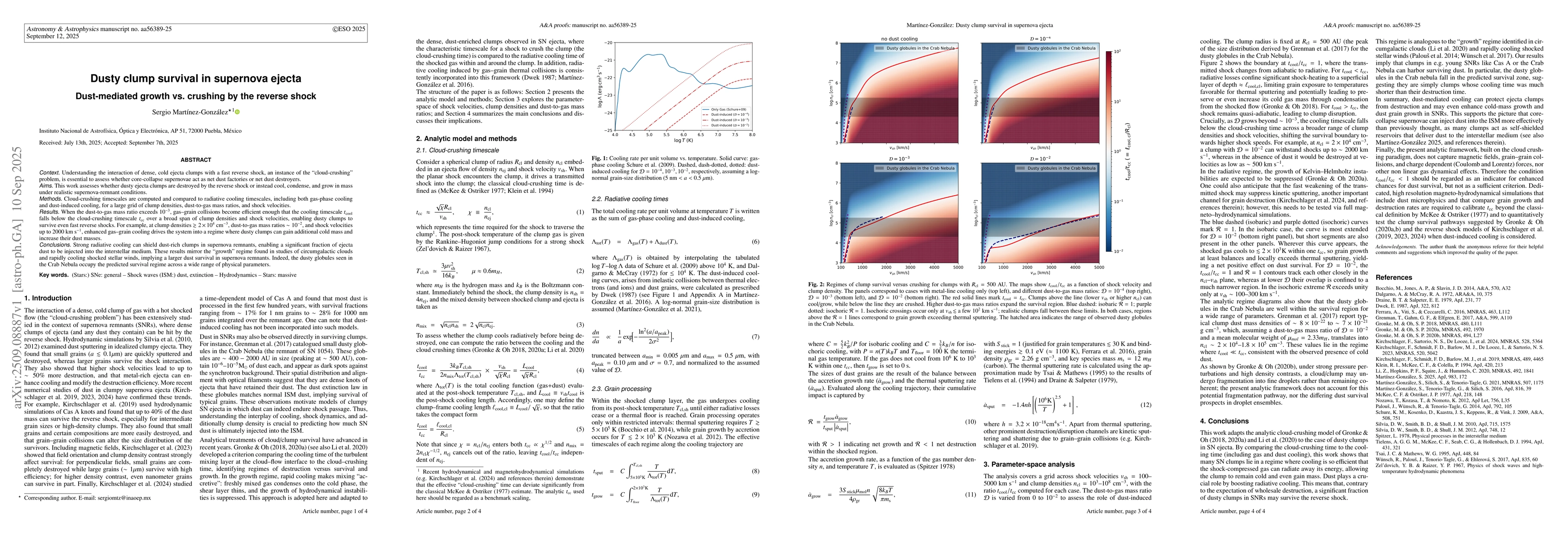 Understanding the interaction of dense, cold ejecta clumps with a fast reverse shock, an instance of the "cloud-crushing" problem, is essential to assess whether core-collapse supernovae act as net dust factories or net dust destroyers. This work assesses whether dusty ejecta clumps are destroyed by the reverse shock or instead cool, condense, and grow in mass under realistic supernova-remnant conditions. Cloud-crushing timescales are computed and compared to radiative cooling timescales, including both gas-phase cooling and dust-induced cooling, for a large grid of clump densities, dust-to-gas mass ratios, and shock velocities. When the dust-to-gas mass ratio exceeds $10^{-3}$, gas-grain collisions become efficient enough that the cooling timescale $t_{\rm cool}$ falls below the cloud-crushing timescale $t_{\rm cc}$ over a broad span of clump densities and shock velocities, enabling dusty clumps to survive even fast reverse shocks. For example, at clump densities $\geq 2 \times 10^{4}$ cm$^{-3}$, dust-to-gas mass ratios $\sim 10^{-2}$, and shock velocities up to $2000$ km s$^{-1}$, enhanced gas-grain cooling drives the system into a regime where dusty clumps can gain additional cold mass and increase their dust masses. Strong radiative cooling can shield dust-rich clumps in supernova remnants, enabling a significant fraction of ejecta dust to be injected into the interstellar medium. These results mirror the "growth" regime found in studies of circumgalactic clouds and rapidly cooling shocked stellar winds, implying a larger dust survival in supernova remnants. Indeed, the dusty globules seen in the Crab Nebula occupy the predicted survival regime across a wide range of physical parameters.