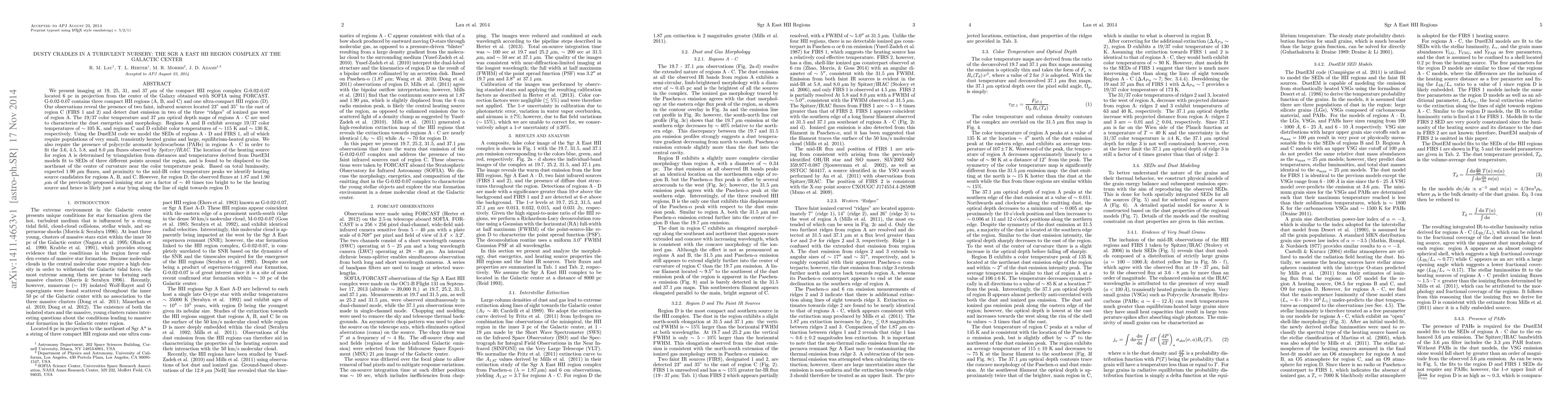 We present imaging at 19, 25, 31, and 37 {\mu}m of the compact HII region complex G-0.02-0.07 located 6 pc in projection from the center of the Galaxy obtained with SOFIA using FORCAST. G-0.02-0.07 contains three compact HII regions (A, B, and C) and one ultra-compact HII region (D). Our observations reveal the presence of two faint, infrared sources located 23'' and 35'' to the east of region C (FIRS 1 and 2) and detect dust emission in two of the three "ridges" of ionized gas west of region A. The 19/37 color temperature and 37 {\mu}m optical depth maps of regions A - C are used to characterize the dust energetics and morphology. Regions A and B exhibit average 19/37 color temperatures of ~105 K, and regions C and D exhibit color temperatures of ~115 K and ~130 K, respectively. Using the DustEM code we model the SEDs of regions A - D and FIRS 1, all of which require populations of very small, transiently heated grains and large, equilibrium-heated grains. We also require the presence of polycyclic aromatic hydrocarbons (PAHs) in regions A - C in order to fit the 3.6, 4.5, 5.8, and 8.0 {\mu}m fluxes observed by Spitzer/IRAC. The location of the heating source for region A is determined by triangulation from distances and temperatures derived from DustEM models fit to SEDs of three different points around the region, and is found to be displaced to the northeast of the center of curvature near the color temperature peak. Based on total luminosity, expected 1.90 {\mu}m fluxes, and proximity to the mid-IR color temperature peaks we identify heating source candidates for regions A, B, and C. However, for region D, the observed fluxes at 1.87 and 1.90 {\mu}m of the previously proposed ionizing star are a factor of ~40 times too bright to be the heating source and hence is likely just a star lying along the line of sight towards region D.