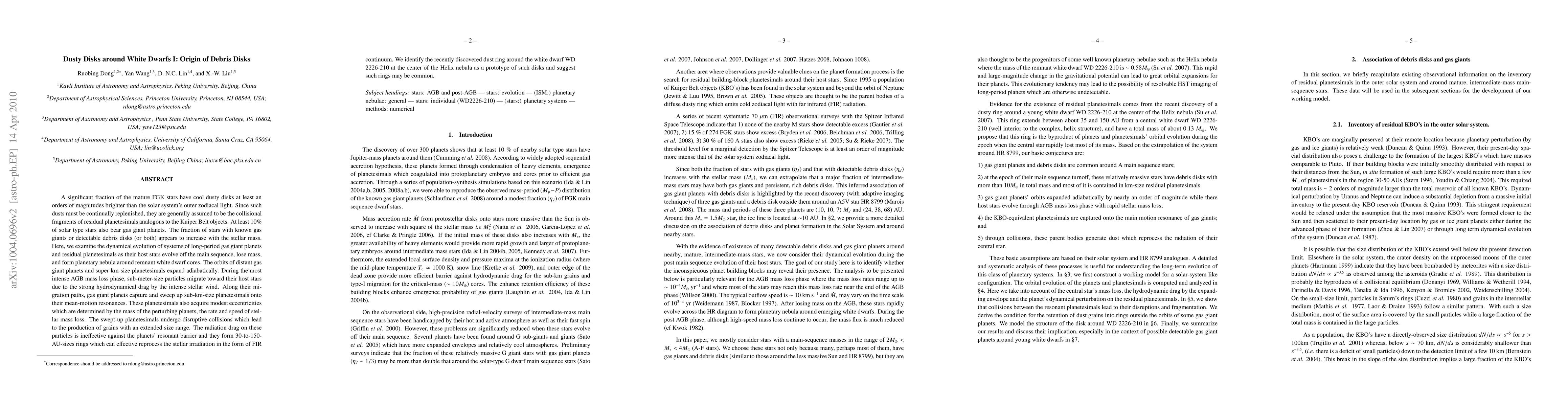 A significant fraction of the mature FGK stars have cool dusty disks at least an orders of magnitudes brighter than the solar system's outer zodiacal light. Since such dusts must be continually replenished, they are generally assumed to be the collisional fragments of residual planetesimals analogous to the Kuiper Belt objects. At least 10% of solar type stars also bear gas giant planets. The fraction of stars with known gas giants or detectable debris disks (or both) appears to increase with the stellar mass. Here, we examine the dynamical evolution of systems of long-period gas giant planets and residual planetesimals as their host stars evolve off the main sequence, lose mass, and form planetary nebula around remnant white dwarf cores. The orbits of distant gas giant planets and super-km-size planetesimals expand adiabatically. During the most intense AGB mass loss phase, sub-meter-size particles migrate toward their host stars due to the strong hydrodynamical drag by the intense stellar wind. Along their migration paths, gas giant planets capture and sweep up sub-km-size planetesimals onto their mean-motion resonances. These planetesimals also acquire modest eccentricities which are determined by the mass of the perturbing planets, the rate and speed of stellar mass loss. The swept-up planetesimals undergo disruptive collisions which lead to the production of grains with an extended size range. The radiation drag on these particles is ineffective against the planets' resonant barrier and they form 30-to-150-AU-sizes rings which can effective reprocess the stellar irradiation in the form of FIR continuum. We identify the recently discovered dust ring around the white dwarf WD 2226-210 at the center of the Helix nebula as a prototype of such disks and suggest such rings may be common.