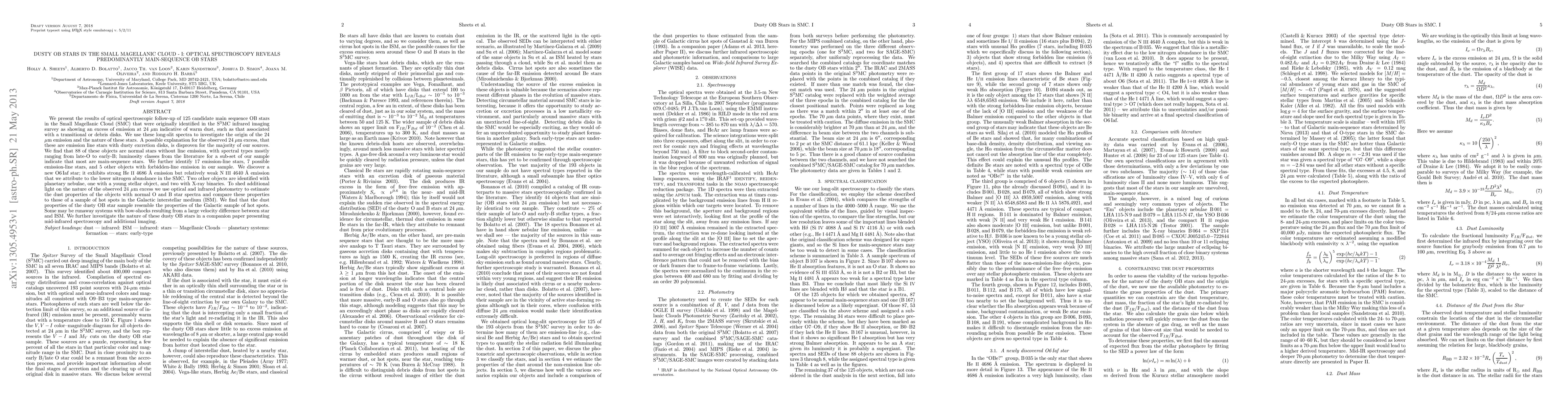 We present the results of optical spectroscopic follow-up of 125 candidate main sequence OB stars in the Small Magellanic Cloud (SMC) that were originally identified in the S3MC infrared imaging survey as showing an excess of emission at 24 um indicative of warm dust, such as that associated with a transitional or debris disks. We use these long-slit spectra to investigate the origin of the 24 um emission and the nature of these stars. A possible explanation for the observed 24 um excess, that these are emission line stars with dusty excretion disks, is disproven for the majority of our sources. We find that 88 of these objects are normal stars without line emission, with spectral types mostly ranging from late-O to early-B; luminosity classes a sub-set of our sample indicate that most are main-sequence stars. We further identify 17 emission-line stars, 7 possible emission-line stars, and 5 other stars with forbidden-line emission. We discover a new O6 Iaf star; it exhibits strong HeII 4686 A emission but relatively weak NIII 4640 A emission that we attribute to the lower nitrogen abundance in the SMC. Two other objects are identified with planetary nebulae, one with a young stellar object, and two with X-ray binaries. To shed additional light on the nature of the observed 24 um excess we use optical and infrared photometry to estimate the dust properties of the objects with normal O and B star spectra and compare these properties to those of a sample of hot spots in the Galactic interstellar medium (ISM). We find that the dust properties of the dusty OB star sample resemble the properties of the Galactic sample of hot spots. Some may be runaway systems with bow-shocks resulting from a large velocity difference between star and ISM. We further investigate the nature of these dusty OB stars in a companion paper presenting mid-infrared spectroscopy and additional imaging.