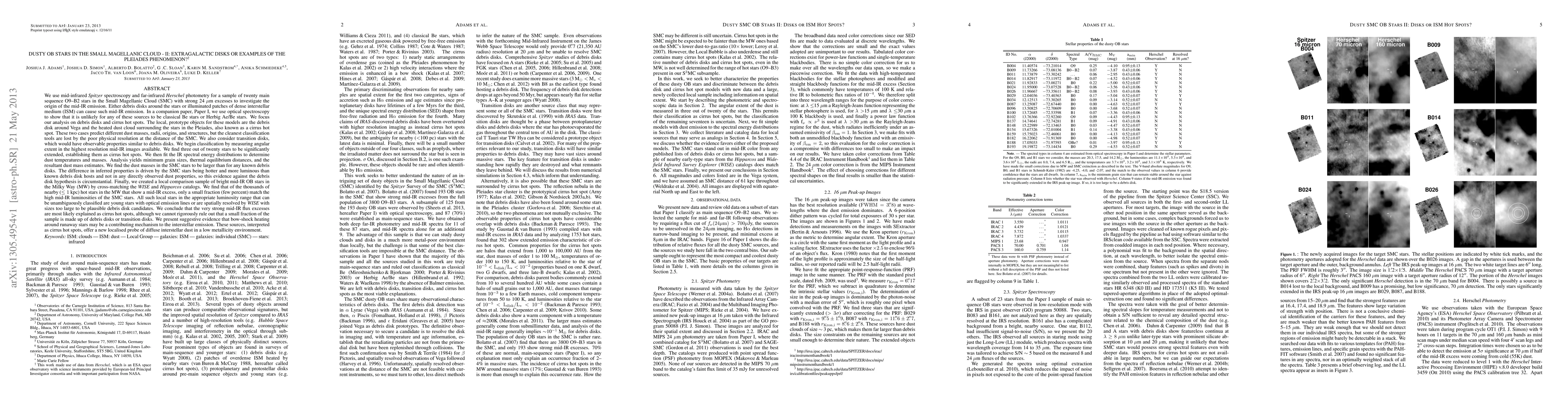 We use mid-infrared Spitzer spectroscopy and far-infrared Herschel photometry for a sample of twenty main sequence O9--B2 stars in the Small Magellanic Cloud (SMC) with strong 24 micron excesses to investigate the origin of the mid-IR emission. Either debris disks around the stars or illuminated patches of dense interstellar medium (ISM) can cause such mid-IR emission. In a companion paper, Paper I, we use optical spectroscopy to show that it is unlikely for any of these sources to be classical Be stars or Herbig Ae/Be stars. We focus our analysis on debris disks and cirrus hot spots. We find three out of twenty stars to be significantly extended in the mid-IR, establishing them as cirrus hot spots. We then fit the IR spectral energy distributions to determine dust temperatures and masses. We find the dust masses in the SMC stars to be larger than for any known debris disks, although this evidence against the debris disk hypothesis is circumstantial. Finally, we created a local comparison sample of bright mid-IR OB stars in the Milky Way (MW) by cross-matching the WISE and Hipparcos catalogs. All such local stars in the appropriate luminosity range that can be unambiguously classified are young stars with optical emission lines or are spatially resolved by WISE with sizes too large to be plausible debris disk candidates. We conclude that the very strong mid-IR flux excesses are most likely explained as cirrus hot spots, although we cannot rigorously rule out that a small fraction of the sample is made up of debris disks or transition disks. We present suggestive evidence that bow-shock heating around runaway stars may be a contributing mechanism to the interstellar emission. These sources, interpreted as cirrus hot spots, offer a new localised probe of diffuse interstellar dust in a low metallicity environment. (Abridged)