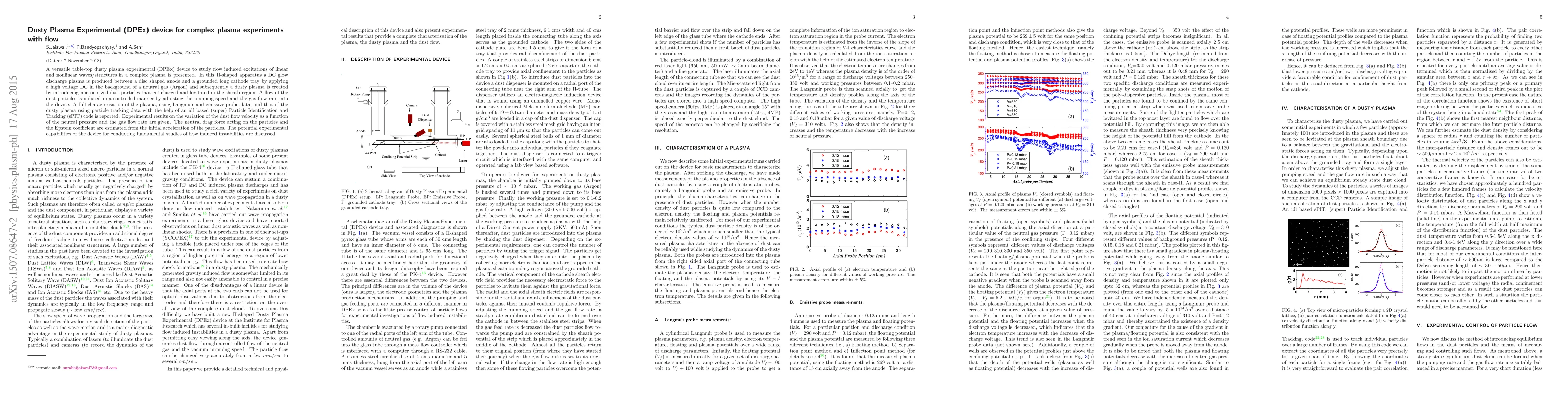 The DPEx device generates a dusty plasma in a {$\Pi$}-shaped apparatus, studying flow-induced excitations of waves/structures through controlled dust particle flow. Experimental results detail the dust flow velocity variations with neutral pressure and gas flow rate, highlighting the device's potential for fundamental studies on flow-induced instabilities.