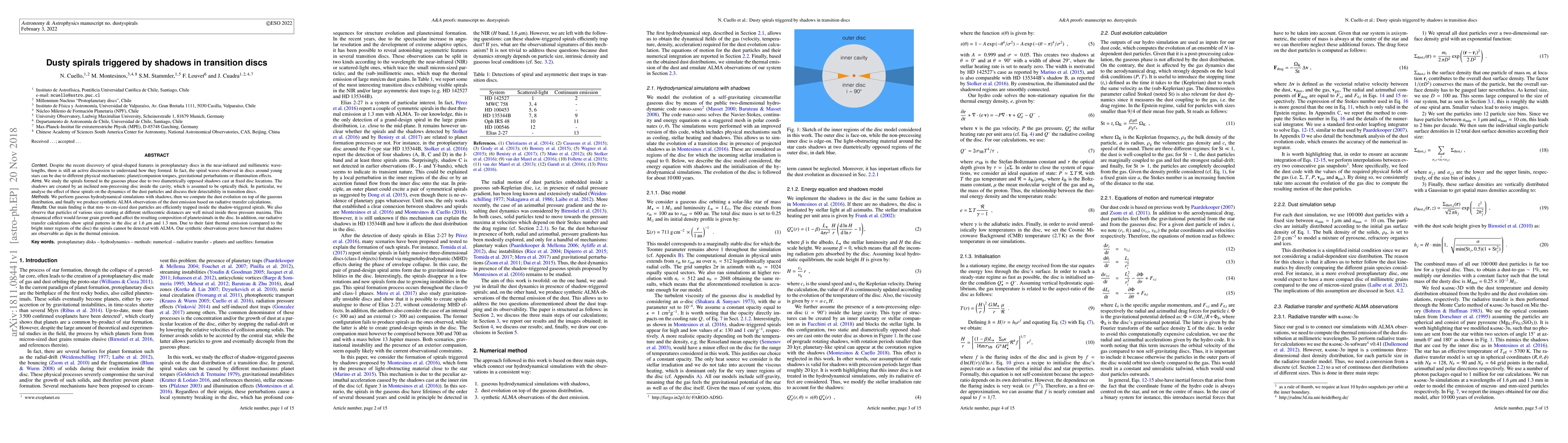 This paper investigates the formation of spiral features in transition discs due to shadows cast by an inclined, optically thick disc inside a cavity. The study finds that these shadows trap mm- to cm-sized dust particles, promoting grain growth and influencing planetesimal composition, while the spirals remain undetectable in ALMA observations due to faint thermal emission.