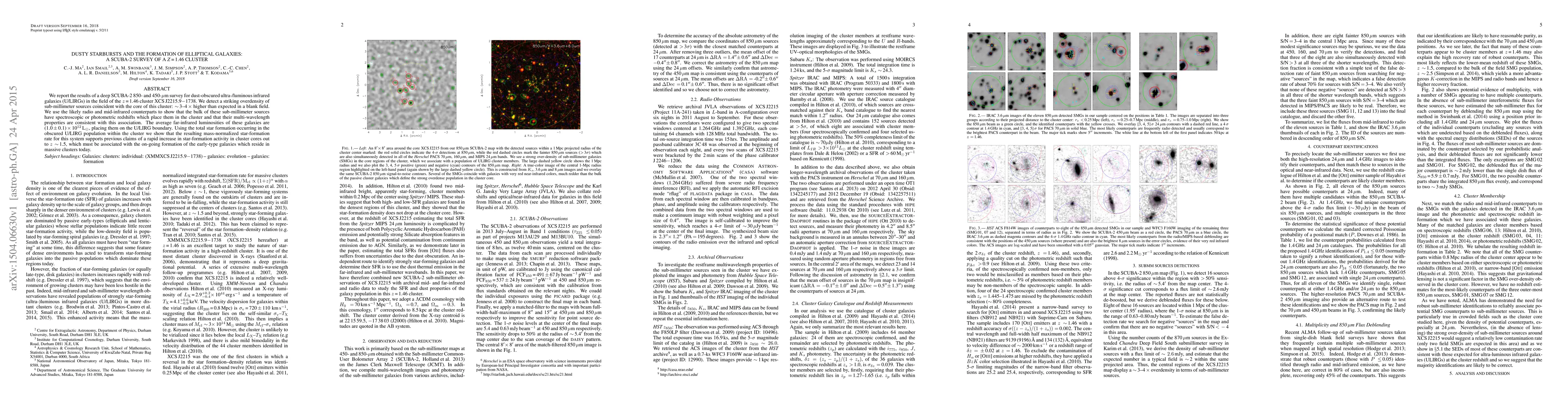 This study uses a SCUBA-2 survey to find a significant overdensity of dust-obscured ultra-luminous infrared galaxies (U/LIRGs) in the z=1.46 cluster XCS J2215.9-1738, suggesting rapid star-formation activity in cluster cores. The detected galaxies have high far-infrared luminosities, indicating they are on the U/LIRG boundary and likely contributing to the formation of early-type galaxies in massive clusters.