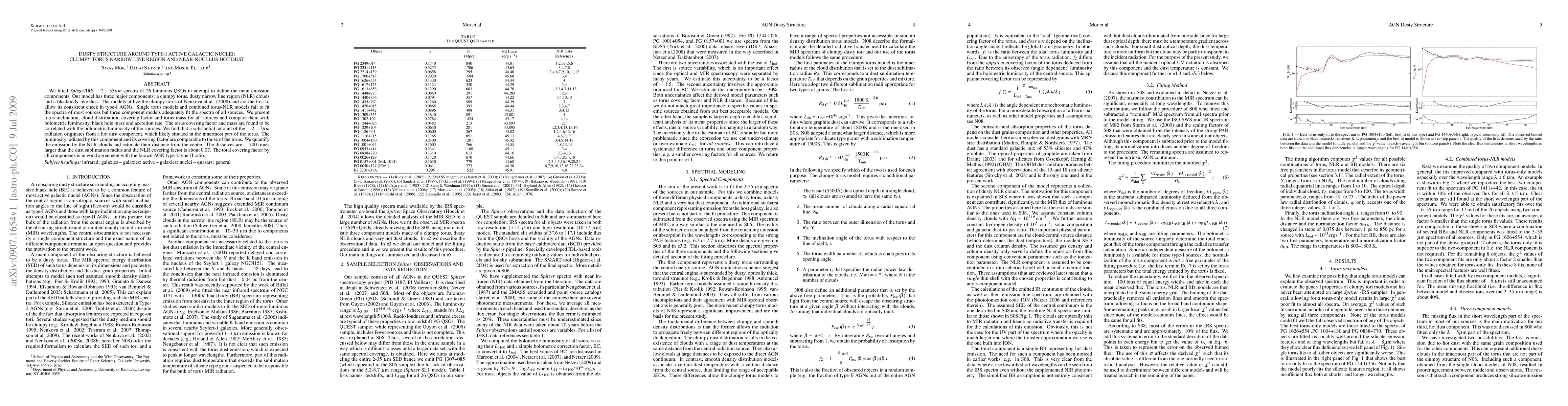 We fitted Spitzer/IRS ~2-35 um spectra of 26 luminous QSOs in attempt to define the main emission components. Our model has three major components: a clumpy torus, dusty narrow line region (NLR) clouds and a blackbody-like dust. The models utilize the clumpy torus of Nenkova et al. (2008) and are the first to allow its consistent check in type-I AGNs. Single torus models and combined torus-NLR models fail to fit the spectra of most sources but three component models adequately fit the spectra of all sources. We present torus inclination, cloud distribution, covering factor and torus mass for all sources and compare them with bolometric luminosity, black hole mass and accretion rate. The torus covering factor and mass are found to be correlated with the bolometric luminosity of the sources. We find that a substantial amount of the ~2-7 um radiation originates from a hot dust component, which likely situated in the innermost part of the torus. The luminosity radiated by this component and its covering factor are comparable to those of the torus. We quantify the emission by the NLR clouds and estimate their distance from the center. The distances are ~700 times larger than the dust sublimation radius and the NLR covering factor is about 0.07. The total covering factor by all components is in good agreement with the known AGN type-I:type-II ratio.