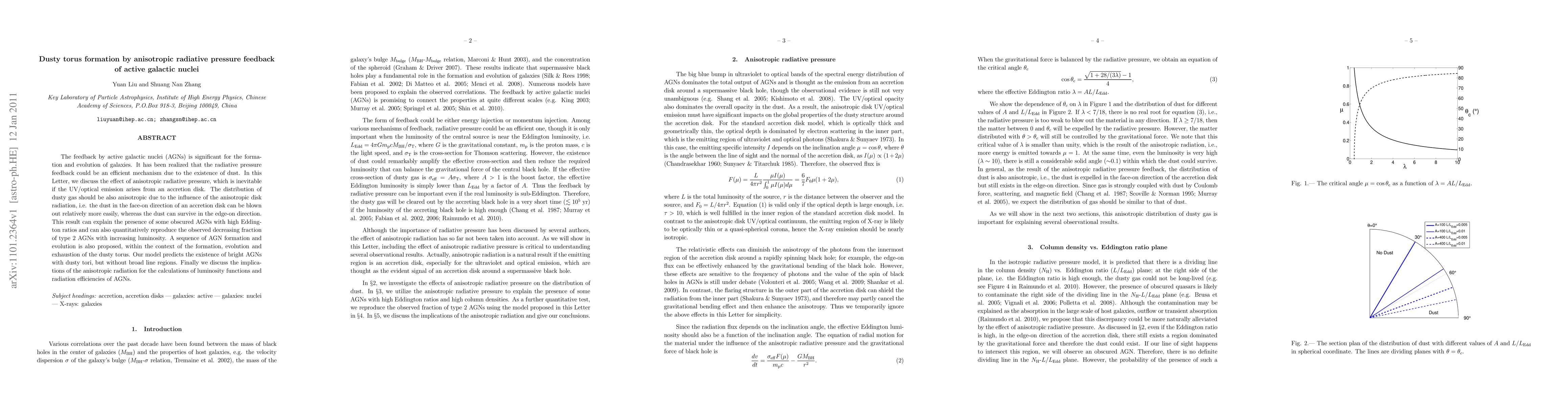 The feedback by active galactic nuclei (AGNs) is significant for the formation and evolution of galaxies. It has been realized that the radiative pressure feedback could be an efficient mechanism due to the existence of dust. In this Letter, we discuss the effect of anisotropic radiative pressure, which is inevitable if the UV/optical emission arises from an accretion disk. The distribution of dusty gas should be also anisotropic due to the influence of the anisotropic disk radiation, i.e. the dust in the face-on direction of an accretion disk can be blown out relatively more easily, whereas the dust can survive in the edge-on direction. This result can explain the presence of some obscured AGNs with high Eddington ratios and can also quantitatively reproduce the observed decreasing fraction of type 2 AGNs with increasing luminosity. A sequence of AGN formation and evolution is also proposed, within the context of the formation, evolution and exhaustion of the dusty torus. Our model predicts the existence of bright AGNs with dusty tori, but without broad line regions. Finally we discuss the implications of the anisotropic radiation for the calculations of luminosity functions and radiation efficiencies of AGNs.