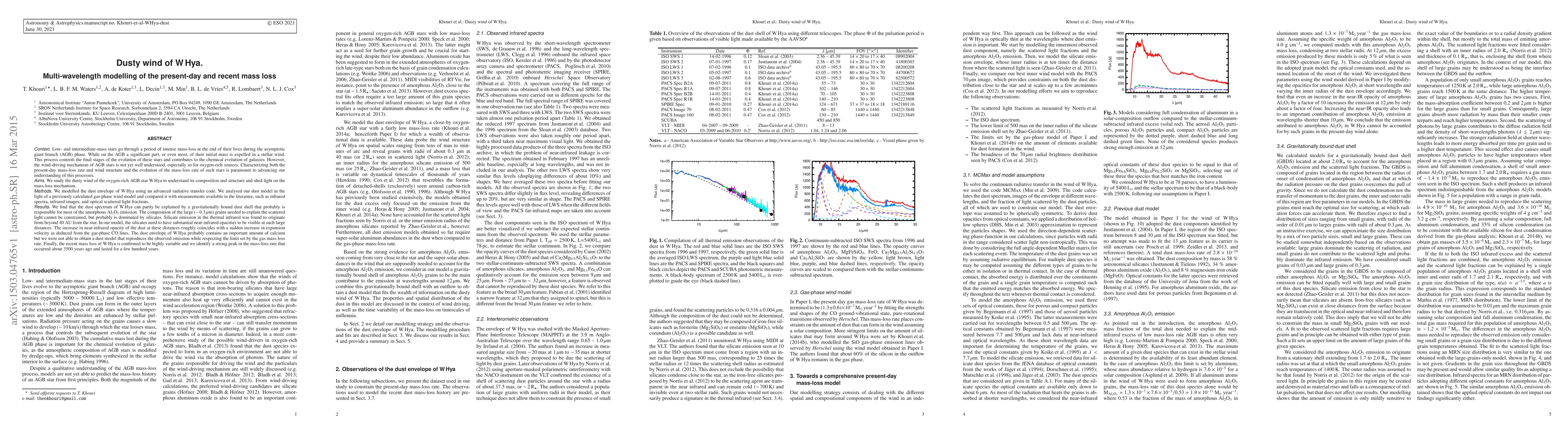 Low- and intermediate-mass stars go through a period of intense mass-loss at the end of their lives in a phase known as the asymptotic giant branch (AGB). During the AGB a significant fraction of their initial mass is expelled in a stellar wind. This process controls the final stages of their evolution and contributes to the chemical evolution of galaxies. However, the wind-driving mechanism of AGB stars is not yet well understood, especially so for oxygen-rich sources. Characterizing both the present-day mass-loss and wind structure and the evolution of the mass-loss rate of such stars is paramount to advancing our understanding of this processes. We modelled the dust envelope of W Hya using an advanced radiative transfer code. The dust model was analysed in the light of a previously calculated gas-phase wind model and compared to measurements available in the literature, such as infrared spectra, infrared images, and optical scattered light fractions. We find that the dust spectrum of W Hya can partly be explained by a gravitationally bound dust shell that probably is responsible for most of the amorphous Al$_2$O$_3$ emission. The composition of the large ($\sim$\,0.3\,$\mu$m) grains needed to explain the scattered light cannot be constrained, but probably is dominated by silicates. Silicate emission in the thermal infrared was found to originate from beyond 40 AU from the star and we find that they need to have substantial near-infrared opacities to be visible at such large distances. The increase in near-infrared opacity of the dust at these distances roughly coincides with a sudden increase in expansion velocity as deduced from the gas-phase CO lines. Finally, the recent mass loss of W Hya is confirmed to be highly variable and we identify a strong peak in the mass-loss rate that occurred about 3500 years ago and lasted for a few hundred years.