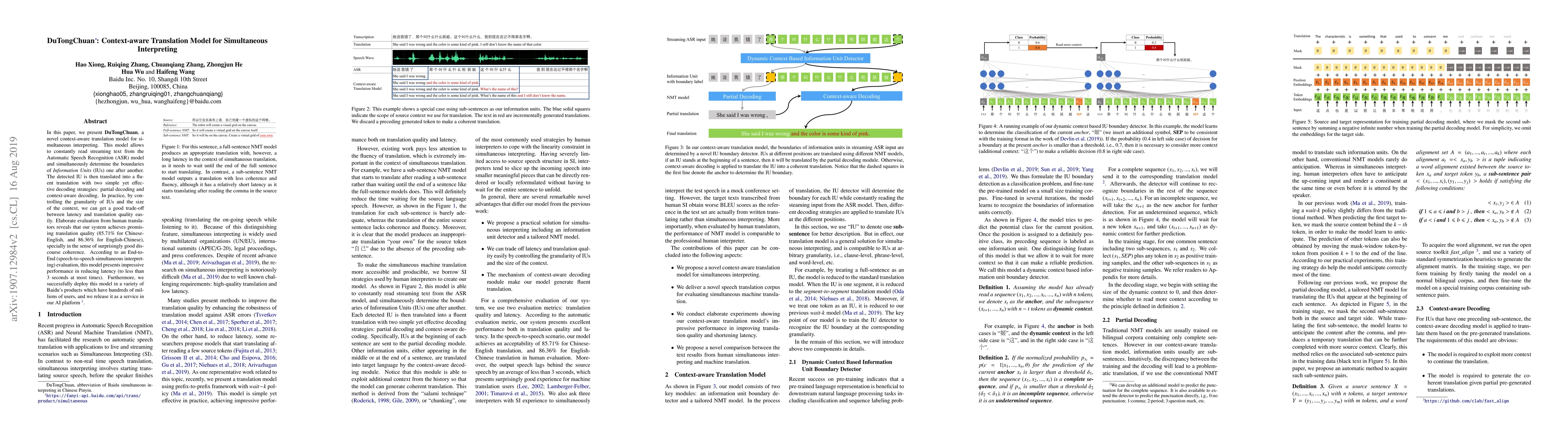 DuTongChuan is a context-aware translation model for simultaneous interpreting, employing partial and context-aware decoding strategies to achieve fluent translations. Evaluations show high translation quality and reduced latency, successfully deployed in Baidu's products.