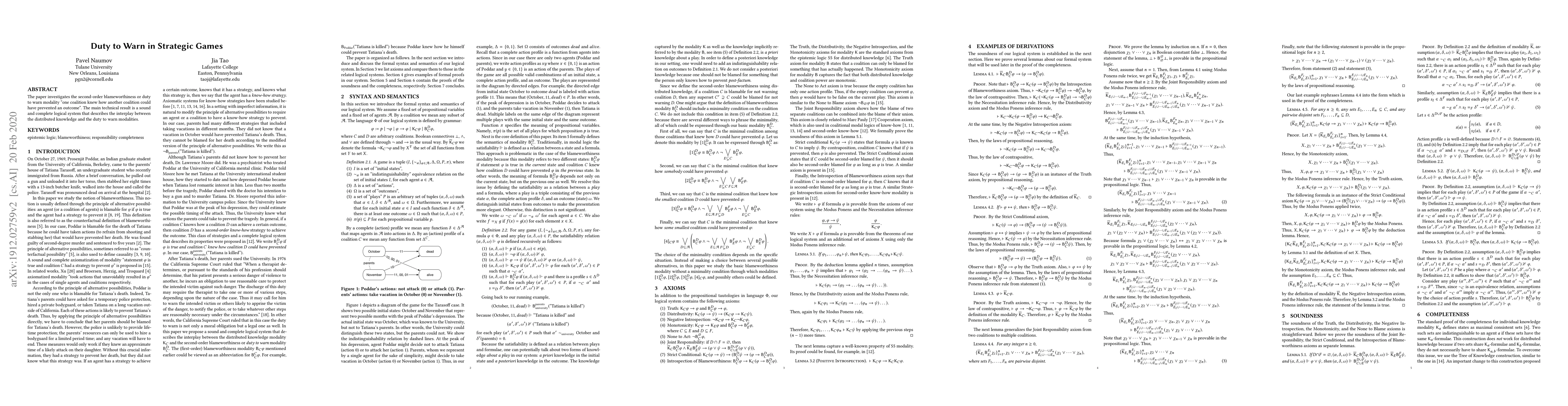 The paper investigates the second-order blameworthiness or duty to warn modality "one coalition knew how another coalition could have prevented an outcome". The main technical result is a sound and complete logical system that describes the interplay between the distributed knowledge and the duty to warn modalities.