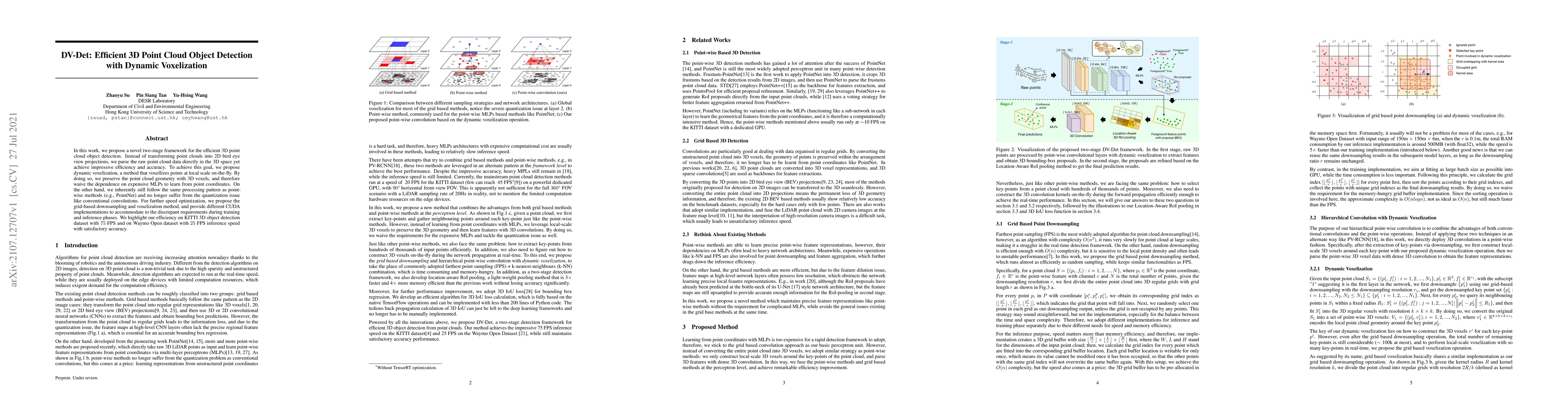 DV-Det introduces a two-stage framework for efficient 3D point cloud object detection using dynamic voxelization, achieving high speed and accuracy without transforming point clouds into 2D projections. The method leverages on-the-fly local voxelization and grid-based downsampling to optimize performance, demonstrating 75 FPS on KITTI and 25 FPS on Waymo datasets.