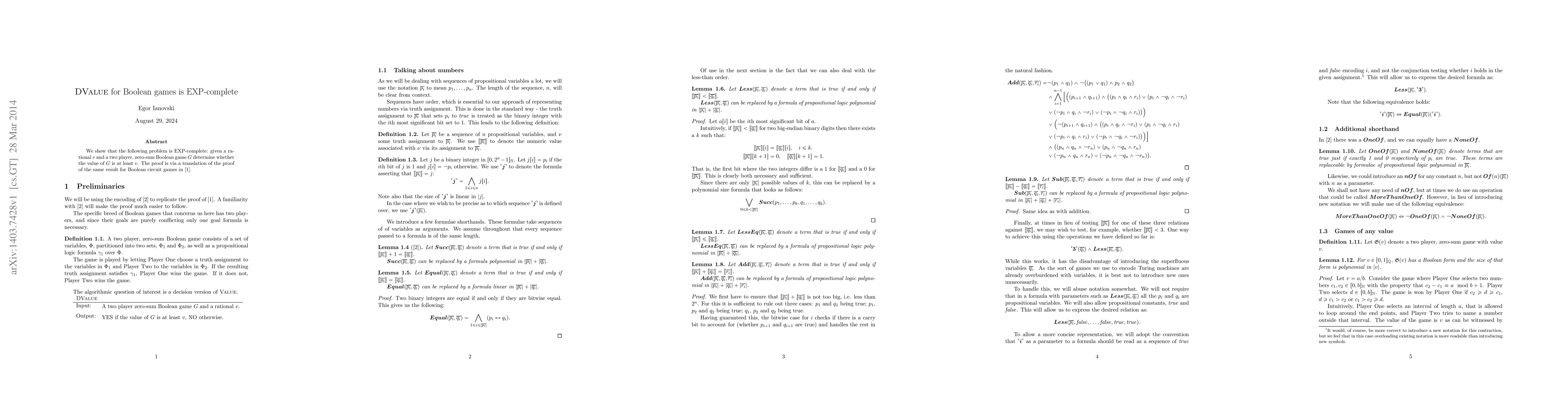 This paper demonstrates that determining whether the value of a two-player, zero-sum Boolean game is at least a given rational number v is EXP-complete. The proof leverages a translation from the established result for Boolean circuit games.