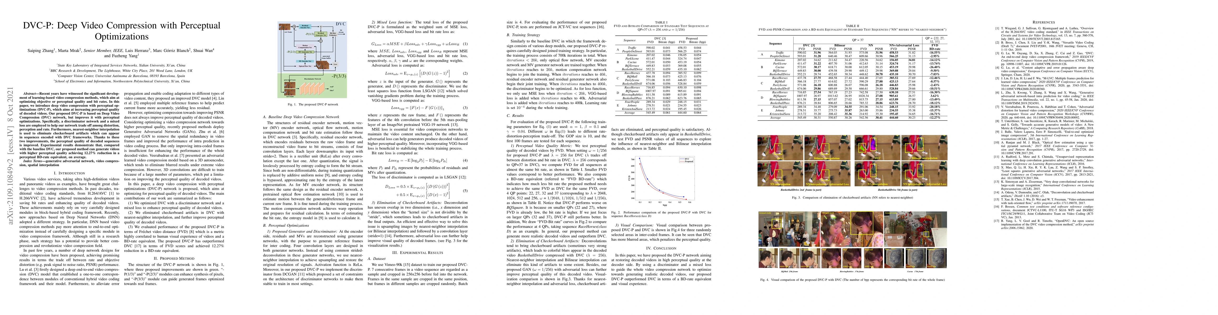 This paper introduces DVC-P, an enhanced deep video compression method that optimizes perceptual quality through perceptual optimizations. It improves upon the DVC network by incorporating a discriminator network and a mixed loss function, along with nearest-neighbor interpolation to reduce artifacts, achieving a 12.27% reduction in perceptual BD-rate compared to the baseline DVC.
