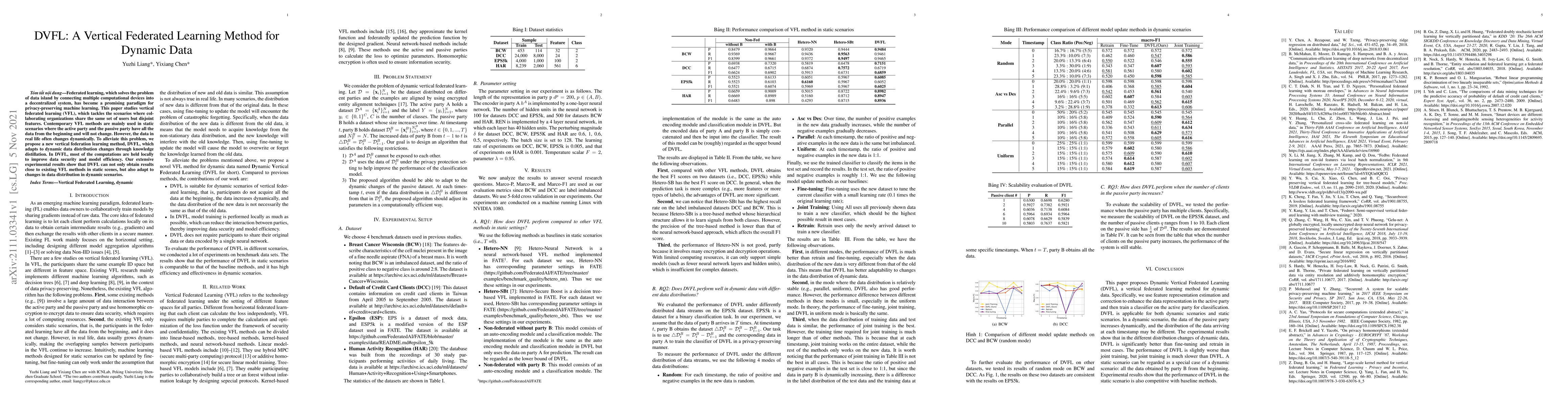 Federated learning, which solves the problem of data island by connecting multiple computational devices into a decentralized system, has become a promising paradigm for privacy-preserving machine learning. This paper studies vertical federated learning (VFL), which tackles the scenarios where collaborating organizations share the same set of users but disjoint features. Contemporary VFL methods are mainly used in static scenarios where the active party and the passive party have all the data from the beginning and will not change. However, the data in real life often changes dynamically. To alleviate this problem, we propose a new vertical federation learning method, DVFL, which adapts to dynamic data distribution changes through knowledge distillation. In DVFL, most of the computations are held locally to improve data security and model efficiency. Our extensive experimental results show that DVFL can not only obtain results close to existing VFL methods in static scenes, but also adapt to changes in data distribution in dynamic scenarios.