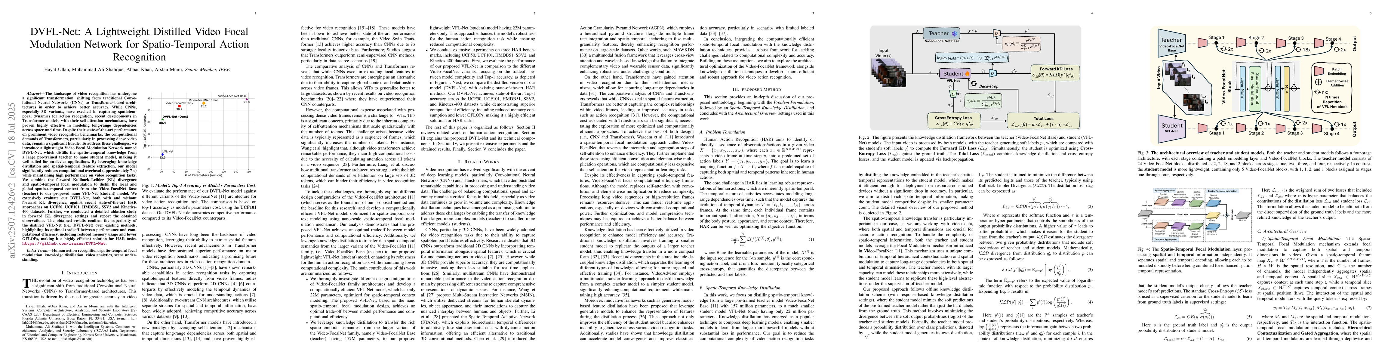 The paper proposes DVFL-Net, a lightweight distilled video focal modulation network for spatio-temporal action recognition. It employs knowledge distillation and spatial-temporal feature modulation, utilizing forward KL divergence to transfer context from a large pre-trained teacher model to a compact student model.