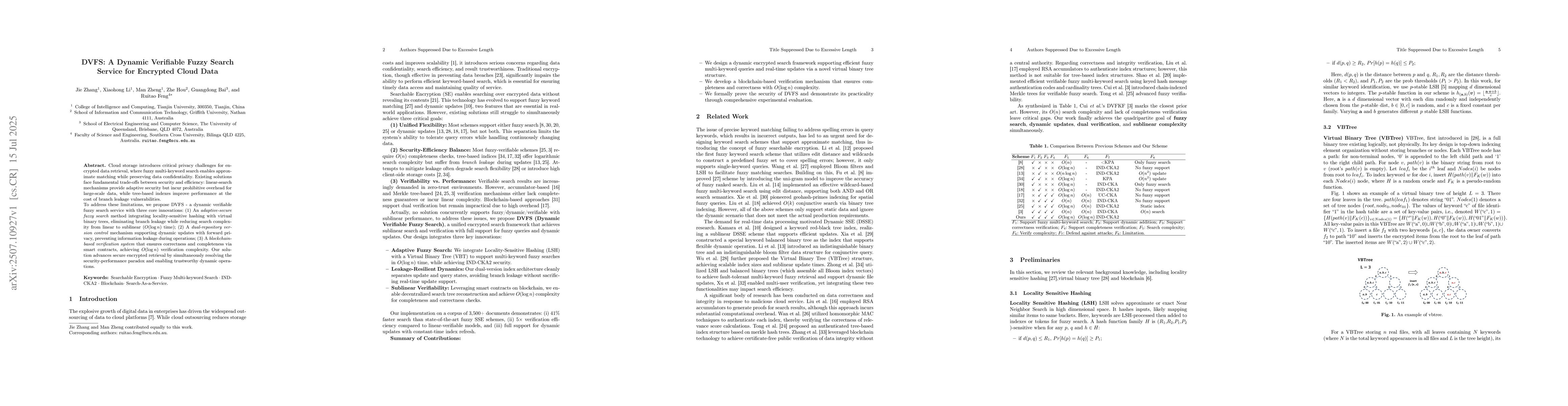 Cloud storage introduces critical privacy challenges for encrypted data retrieval, where fuzzy multi-keyword search enables approximate matching while preserving data confidentiality. Existing solutions face fundamental trade-offs between security and efficiency: linear-search mechanisms provide adaptive security but incur prohibitive overhead for large-scale data, while tree-based indexes improve performance at the cost of branch leakage vulnerabilities. To address these limitations, we propose DVFS - a dynamic verifiable fuzzy search service with three core innovations: (1) An \textit{adaptive-secure fuzzy search} method integrating locality-sensitive hashing with virtual binary trees, eliminating branch leakage while reducing search complexity from linear to sublinear ($O(\log n)$ time); (2) A \textit{dual-repository version control} mechanism supporting dynamic updates with forward privacy, preventing information leakage during operations; (3) A \textit{blockchain-based verification system} that ensures correctness and completeness via smart contracts, achieving $O(\log n)$ verification complexity. Our solution advances secure encrypted retrieval by simultaneously resolving the security-performance paradox and enabling trustworthy dynamic operations.