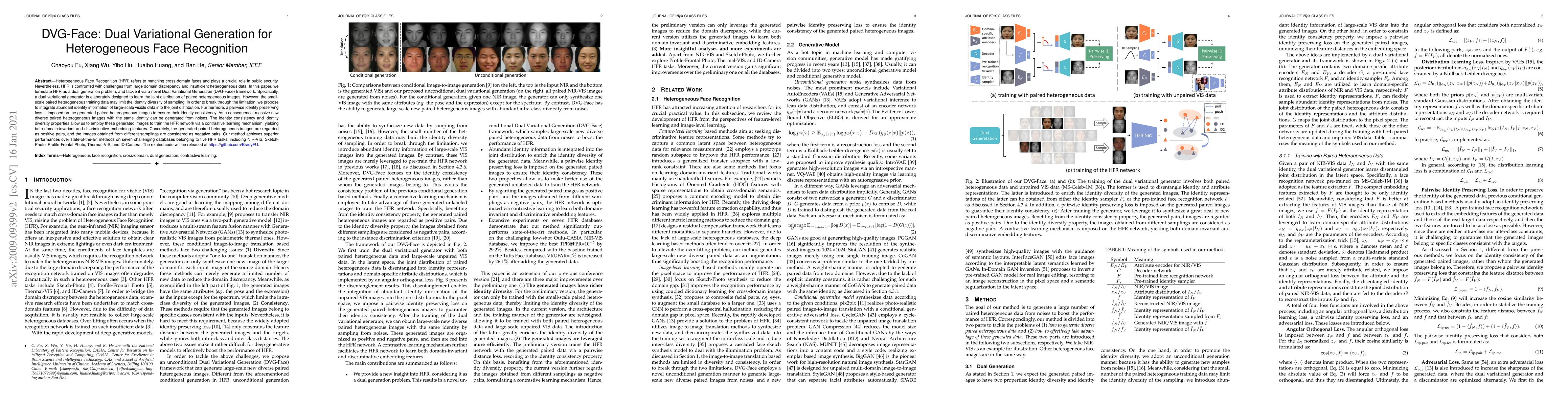The paper introduces a Dual Variational Generation (DVG-Face) framework for Heterogeneous Face Recognition (HFR), addressing the challenge of large domain discrepancy and limited paired data. It generates diverse paired images to train an HFR network using contrastive learning, achieving superior performance on multiple HFR tasks.