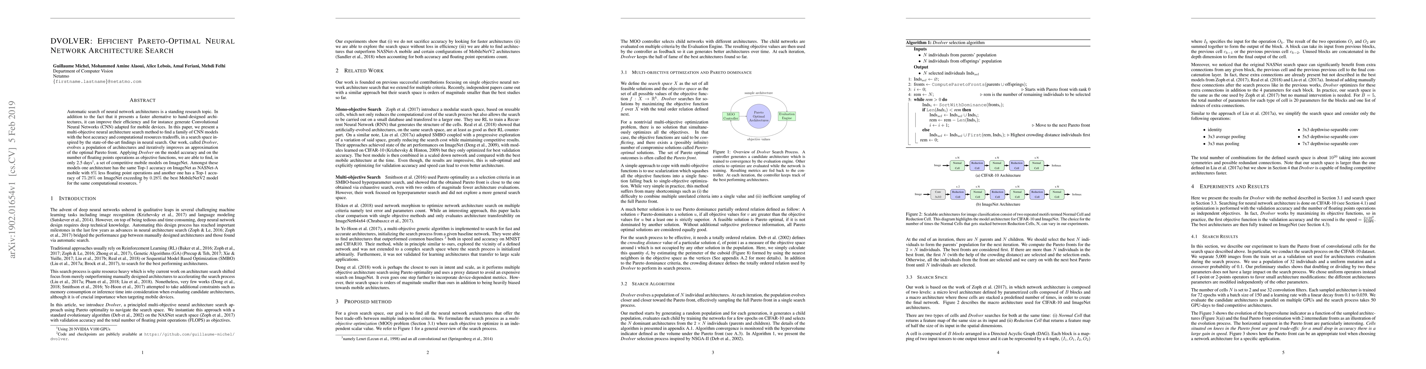 Dvolver is a multi-objective neural architecture search method that efficiently discovers a set of optimal Convolutional Neural Network (CNN) models balancing accuracy and computational efficiency. In just 2.5 days, it identifies competitive mobile models on ImageNet, including one with equal accuracy to NASNet-A but fewer operations and another surpassing MobileNetV2 in accuracy for the same resource constraints.