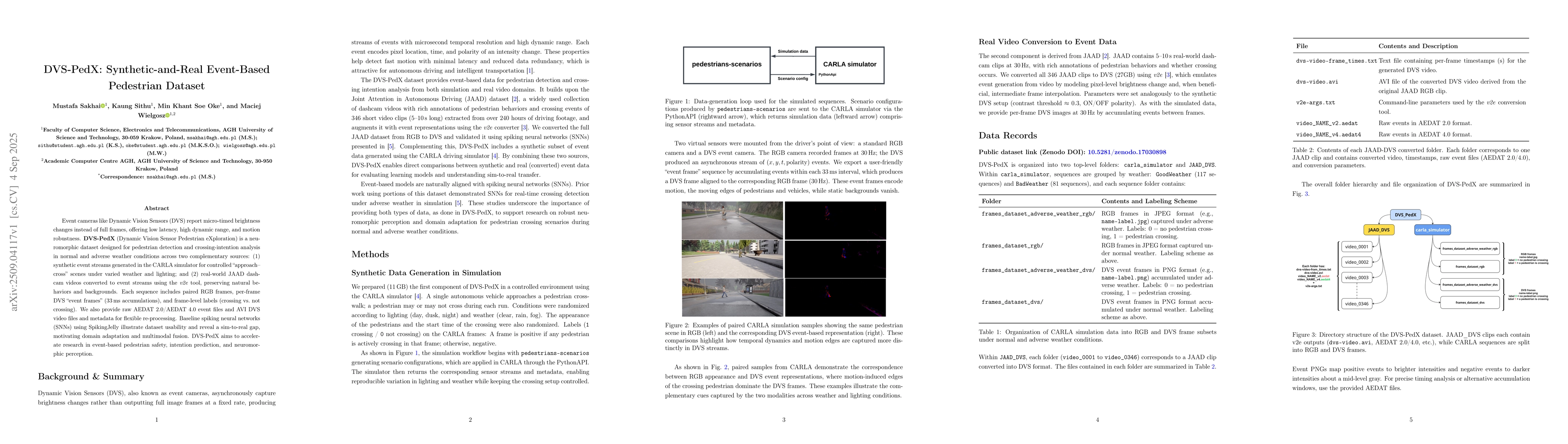 Event cameras like Dynamic Vision Sensors (DVS) report micro-timed brightness changes instead of full frames, offering low latency, high dynamic range, and motion robustness. DVS-PedX (Dynamic Vision Sensor Pedestrian eXploration) is a neuromorphic dataset designed for pedestrian detection and crossing-intention analysis in normal and adverse weather conditions across two complementary sources: (1) synthetic event streams generated in the CARLA simulator for controlled "approach-cross" scenes under varied weather and lighting; and (2) real-world JAAD dash-cam videos converted to event streams using the v2e tool, preserving natural behaviors and backgrounds. Each sequence includes paired RGB frames, per-frame DVS "event frames" (33 ms accumulations), and frame-level labels (crossing vs. not crossing). We also provide raw AEDAT 2.0/AEDAT 4.0 event files and AVI DVS video files and metadata for flexible re-processing. Baseline spiking neural networks (SNNs) using SpikingJelly illustrate dataset usability and reveal a sim-to-real gap, motivating domain adaptation and multimodal fusion. DVS-PedX aims to accelerate research in event-based pedestrian safety, intention prediction, and neuromorphic perception.