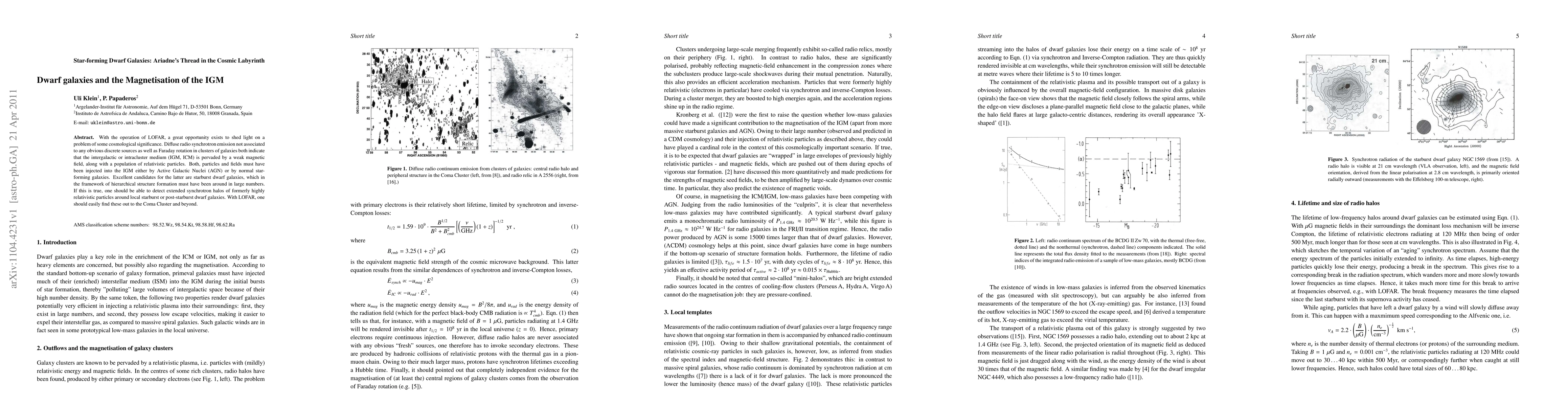 With the operation of LOFAR, a great opportunity exists to shed light on a problemof some cosmological significance. Diffuse radio synchrotron emission not associated to any obvious discrete sources as well as Faraday rotation in clusters of galaxies both indicate that the intergalactic or intracluster medium (IGM, ICM) is pervaded by a weak magnetic field, along with a population of relativistic particles. Both, particles and fields must have been injected into the IGM either by Active Galactic Nuclei (AGN) or by normal starforming galaxies. Excellent candidates for the latter are starburst dwarf galaxies, which in the framework of hierarchical structure formation must have been around in large numbers. If this is true, one should be able to detect extended synchrotron halos of formerly highly relativistic particles around local starburst or post-starburst dwarf galaxies. With LOFAR, one should easily find these out to the Coma Cluster and beyond.