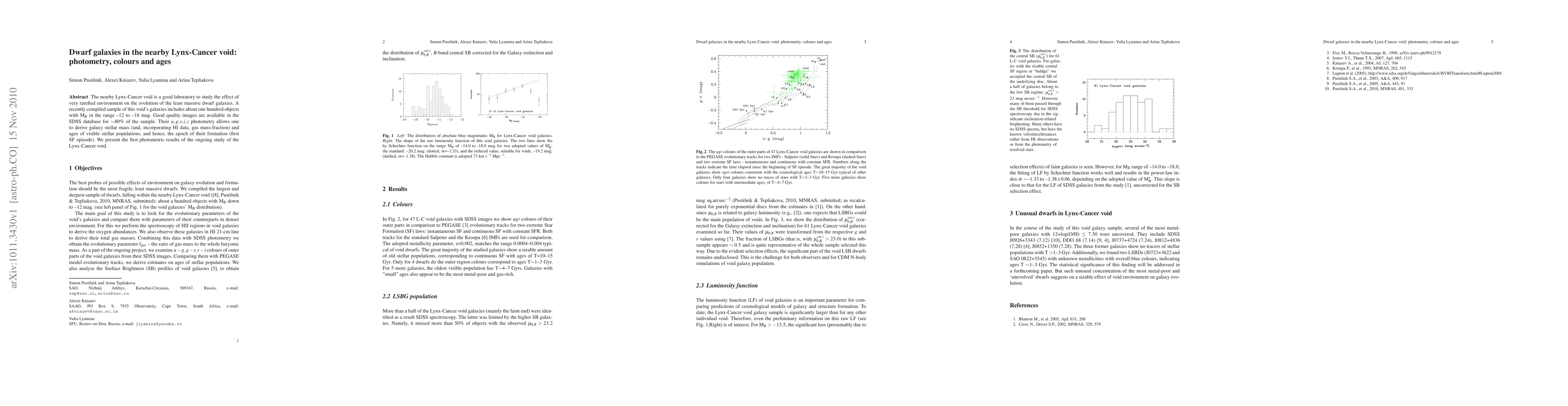 The nearby Lynx-Cancer void is a good laboratory to study the effect of very rarefied environment on the evolution of the least massive dwarf galaxies. A recently compiled sample of this void's galaxies includes about one hundred objects with M_B in the range -12 to -18 mag. Good quality images are available in the SDSS database for ~80% of the sample. Their u,g,r,i,z photometry allows one to derive galaxy stellar mass (and, incorporating HI data, gas mass-fraction) and ages of visible stellar populations, and hence, the epoch of their formation (first SF episode). We present the first photometric results of the ongoing study of the Lynx-Cancer void.