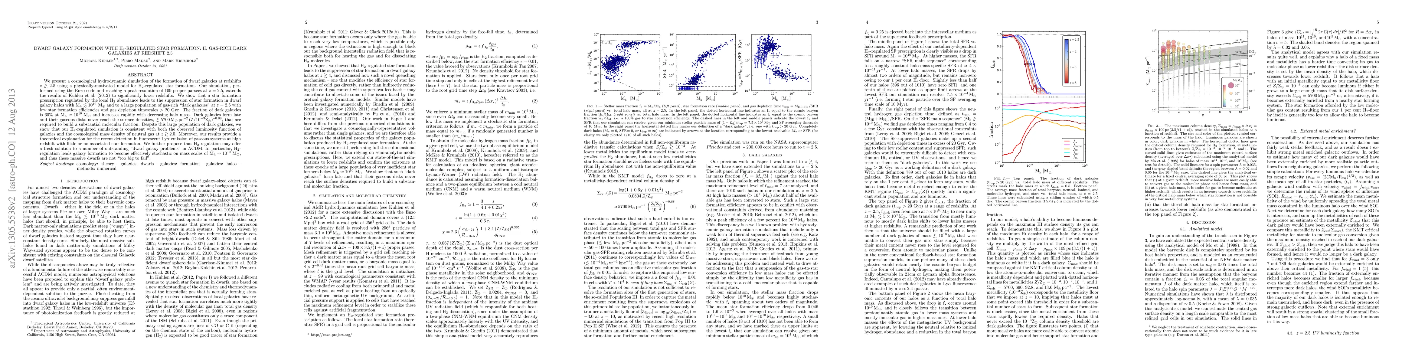 We present a cosmological hydrodynamic simulation of the formation of dwarf galaxies at redshifts z>~2.5 using a physically-motivated model for H2-regulated star formation. Our simulation, performed using the Enzo code and reaching a peak resolution of 109 proper parsecs at z=2.5, extends the results of Kuhlen et al. (2012) to significantly lower redshifts. We show that a star formation prescription regulated by the local H2 abundance leads to the suppression of star formation in dwarf galaxy halos with M_h <~ 10^10 Msun and to a large population of gas-rich "dark galaxies" at z=2.5 with low star formation efficiencies and gas depletion timescales >20 Gyr. The fraction of dark galaxies is 60% at M_h ~ 10^10 Msun and increases rapidly with decreasing halo mass. Dark galaxies form late and their gaseous disks never reach the surface densities, > ~5700 Msun / pc^2 (Z/10^-3 Zsun)^(-0.88), that are required to build a substantial molecular fraction. Despite this large population of dark galaxies, we show that our H2-regulated simulation is consistent with both the observed luminosity function of galaxies and the cosmological mass density of neutral gas at z>~2.5. Moreover, our results provide a theoretical explanation for the recent detection in fluorescent Ly-alpha emission of gaseous systems at high redshift with little or no associated star formation. We further propose that H2-regulation may offer a fresh solution to a number of outstanding "dwarf galaxy problems" in LambdaCDM. In particular, H2-regulation leads galaxy formation to become effectively stochastic on mass scales of M_h ~ 10^10 Msun, and thus these massive dwarfs are not "too big to fail".