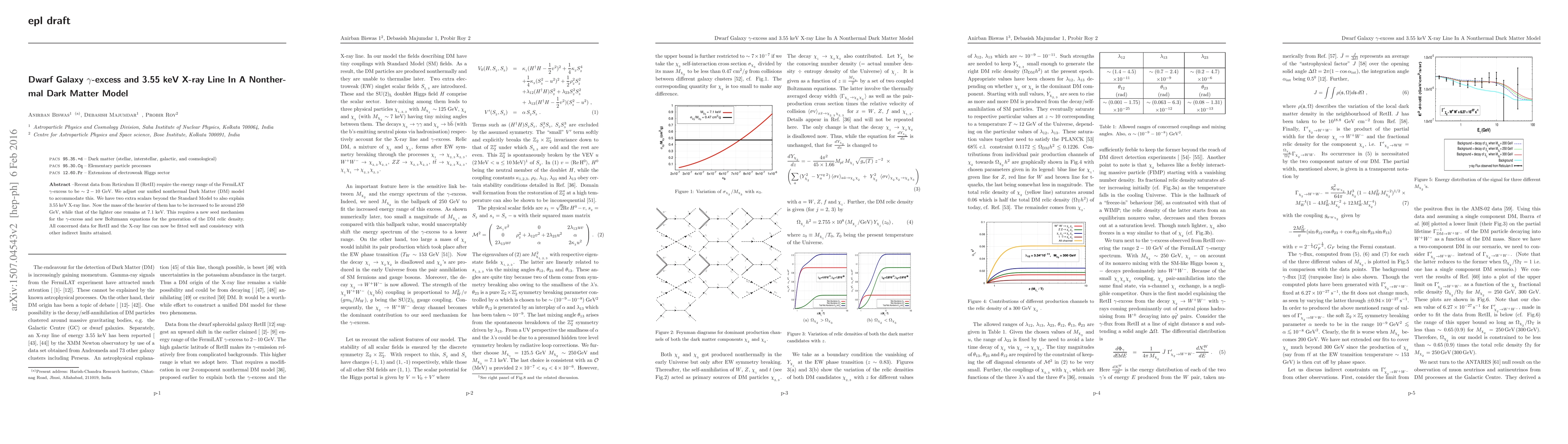 This paper adjusts a nonthermal Dark Matter model to fit recent FermiLAT $\gamma$-excess data from Reticulum II and explains the 3.55 keV X-ray line using two extra scalars. The heavier scalar's mass is increased to 250 GeV, necessitating a new seed mechanism and modified Boltzmann equations.