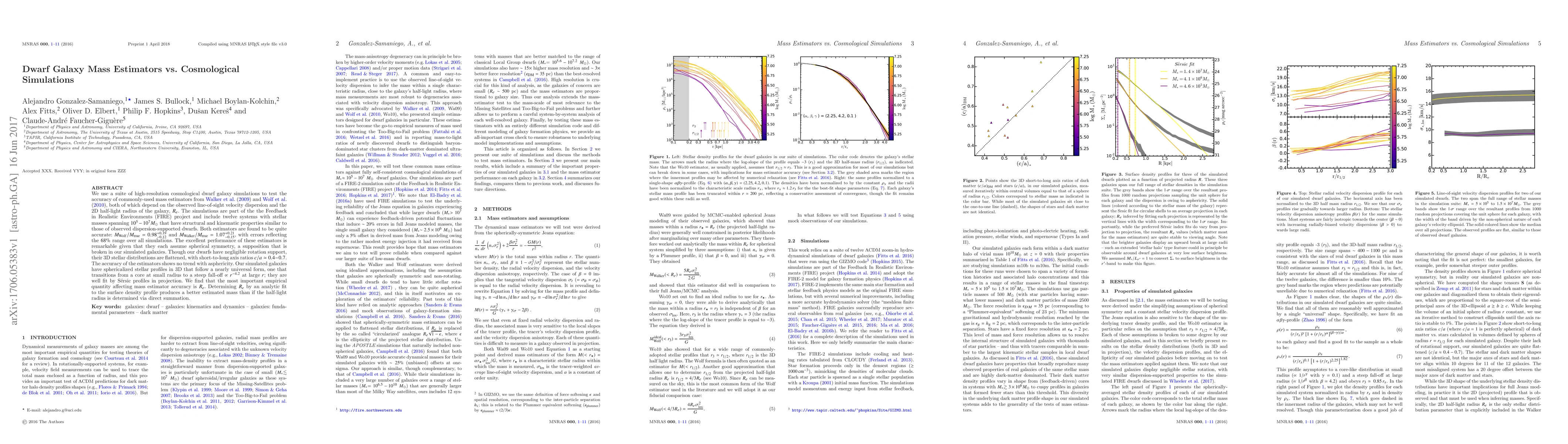 We use a suite of high-resolution cosmological dwarf galaxy simulations to test the accuracy of commonly-used mass estimators from Walker et al.(2009) and Wolf et al.(2010), both of which depend on the observed line-of-sight velocity dispersion and the 2D half-light radius of the galaxy, $Re$. The simulations are part of the the Feedback in Realistic Environments (FIRE) project and include twelve systems with stellar masses spanning $10^{5} - 10^{7} M_{\odot}$ that have structural and kinematic properties similar to those of observed dispersion-supported dwarfs. Both estimators are found to be quite accurate: $M_{Wolf}/M_{true} = 0.98^{+0.19}_{-0.12}$ and $M_{Walker}/M_{true} =1.07^{+0.21}_{-0.15}$, with errors reflecting the 68% range over all simulations. The excellent performance of these estimators is remarkable given that they each assume spherical symmetry, a supposition that is broken in our simulated galaxies. Though our dwarfs have negligible rotation support, their 3D stellar distributions are flattened, with short-to-long axis ratios $ c/a \simeq 0.4-0.7$. The accuracy of the estimators shows no trend with asphericity. Our simulated galaxies have sphericalized stellar profiles in 3D that follow a nearly universal form, one that transitions from a core at small radius to a steep fall-off $\propto r^{-4.2}$ at large $r$, they are well fit by S\'ersic profiles in projection. We find that the most important empirical quantity affecting mass estimator accuracy is $Re$ . Determining $Re$ by an analytic fit to the surface density profile produces a better estimated mass than if the half-light radius is determined via direct summation.