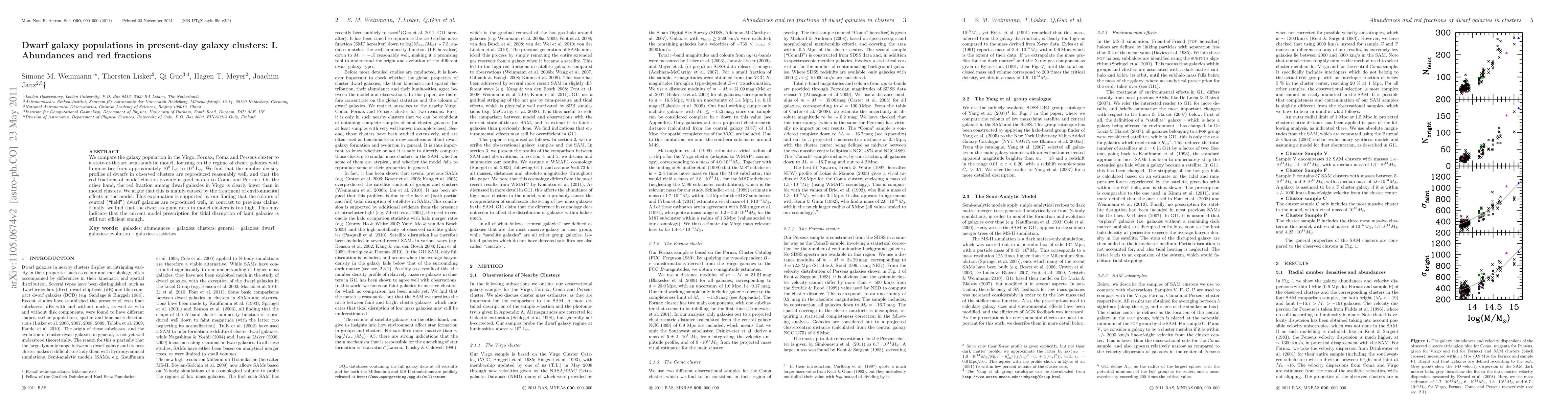 We compare the galaxy population in the Virgo, Fornax, Coma and Perseus cluster to a state-of-the-art semi-analytic model, focusing on the regime of dwarf galaxies with luminosities from approximately 10^8 L_sun to 10^9 L_sun. We find that the number density profiles of dwarfs in observed clusters are reproduced reasonably well, and that the red fractions of model clusters provide a good match to Coma and Perseus. On the other hand, the red fraction among dwarf galaxies in Virgo is clearly lower than in model clusters. We argue that this is mainly caused by the treatment of environmental effects in the model. This explanation is supported by our finding that the colours of central ("field") dwarf galaxies are reproduced well, in contrast to previous claims. Finally, we find that the dwarf-to-giant ratio in model clusters is too high. This may indicate that the current model prescription for tidal disruption of faint galaxies is still not efficient enough.