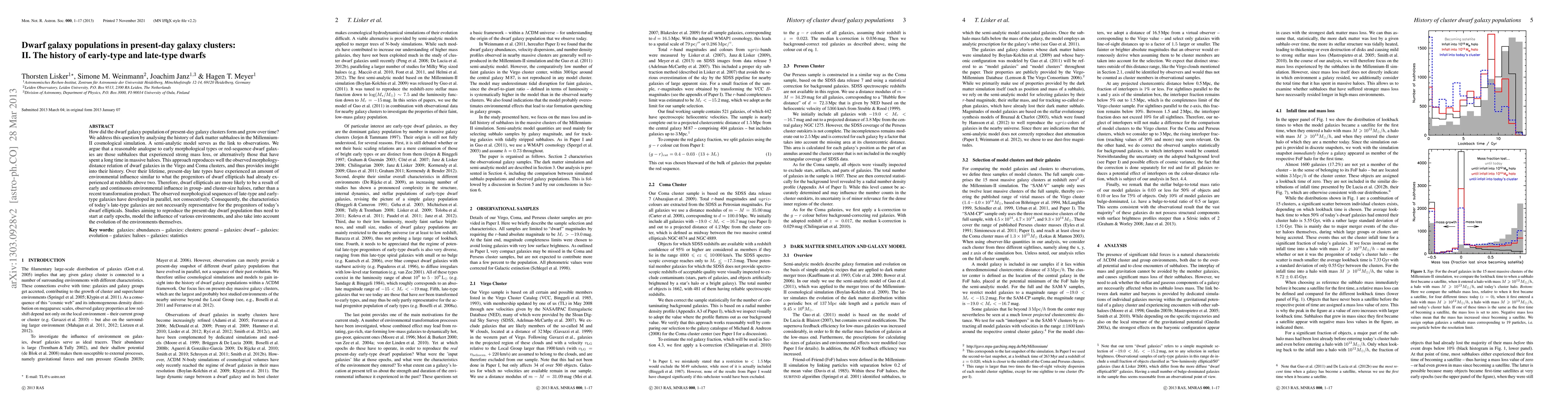 The research uses the Millennium-II simulation and a semi-analytic model to study dwarf galaxy formation in clusters. It suggests that early-type dwarfs resulted from continuous environmental influence in group- and cluster-size haloes since high redshifts, while late-type dwarfs experienced similar environmental impact over their lifetime. The study implies that present-day dwarf galaxy populations need to be modeled considering early epoch evolution and varied environmental influences.